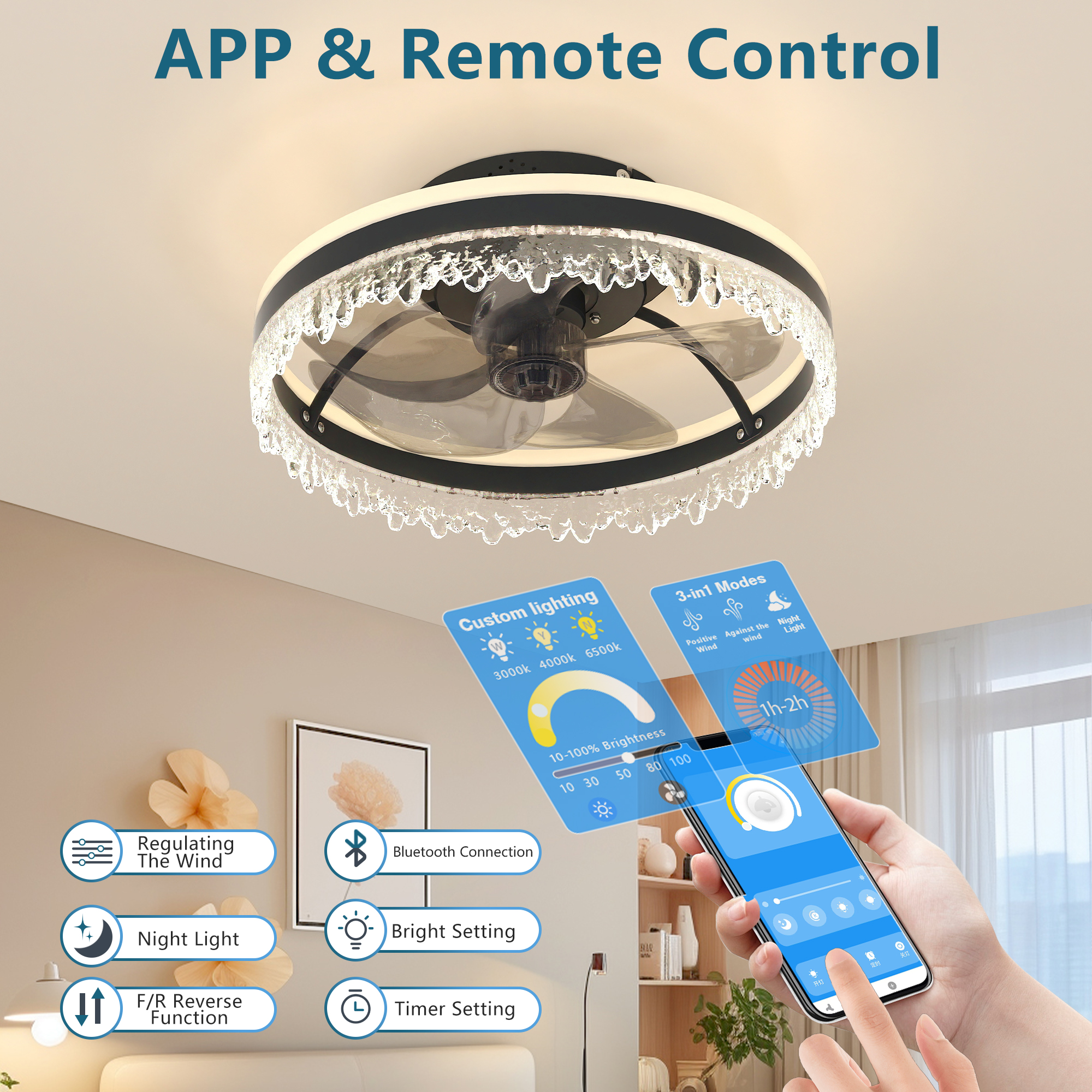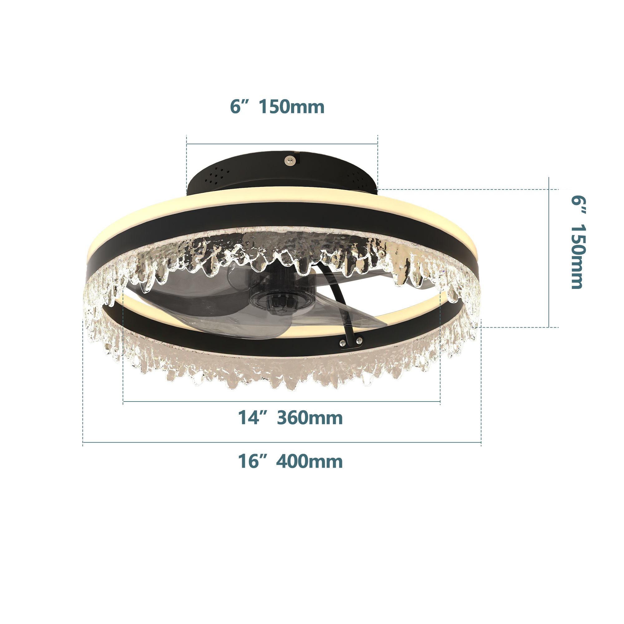 Modern LED Ceiling Fan with Light – 16'' Dimmable Ceiling Light with Invisible Blades and Crystal Design, Remote Control & Adjustable Color Temperature, Quiet Fan for Bedroom, Living Room,Black