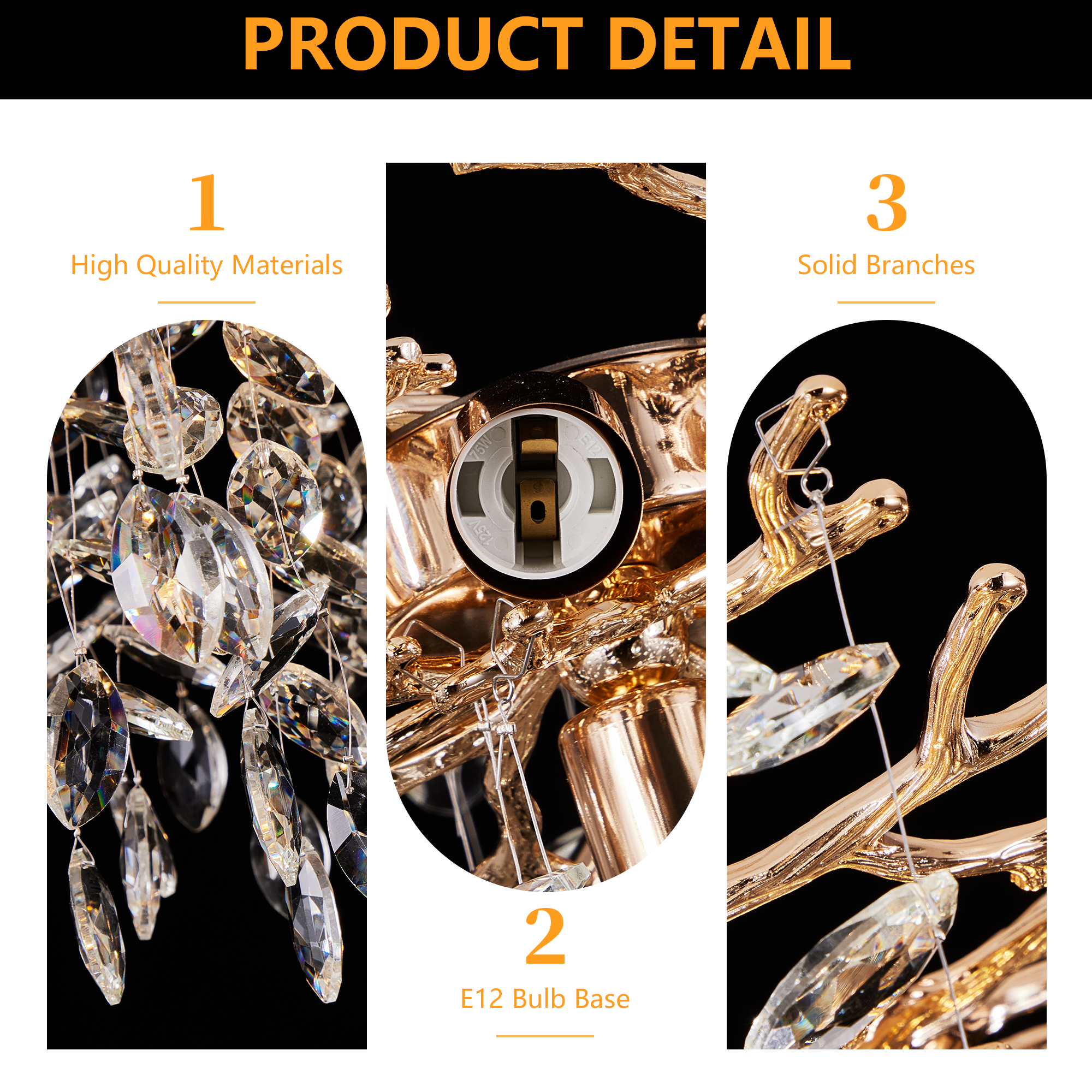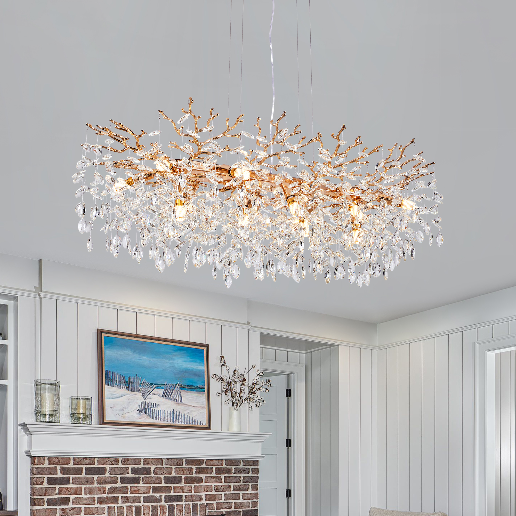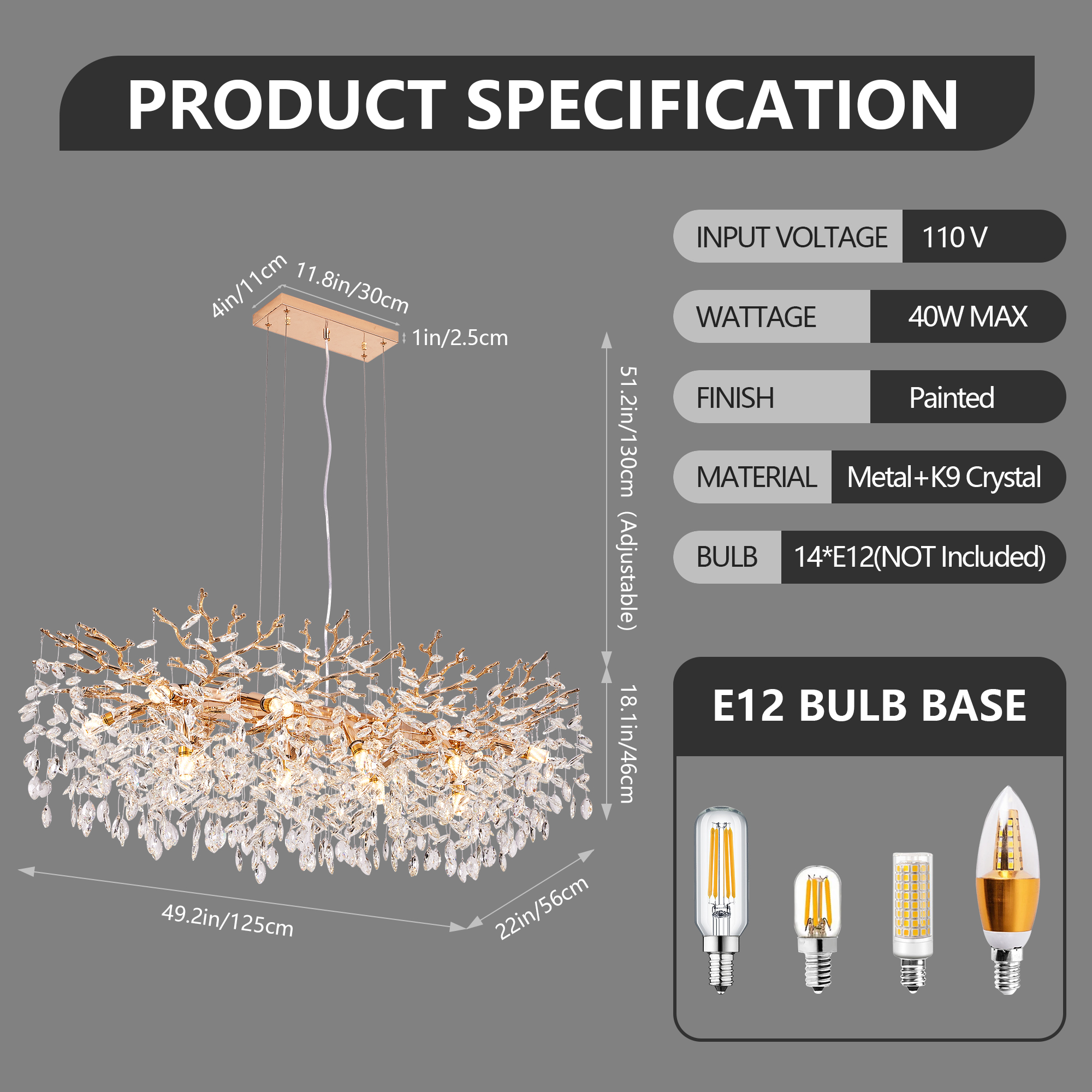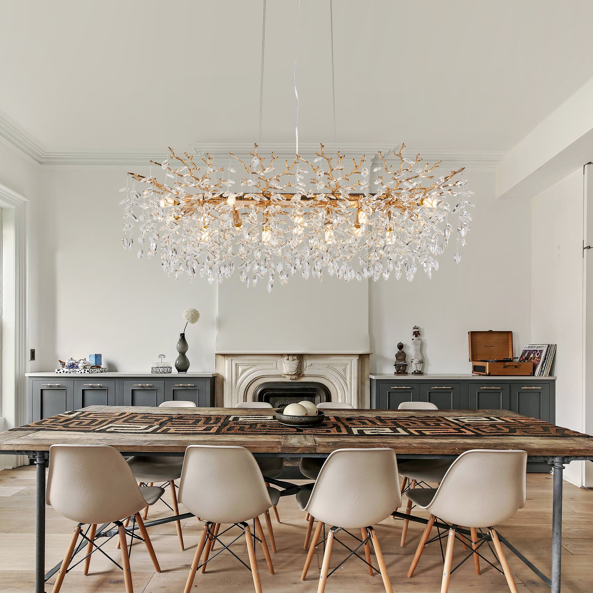 NEOSGO Modern Rectangular Chandelier, 49.2" Gold Crystal Tree Branch Chandelier 14 Lights Luxury Raindrop Light for Dining Room, Kitchen Island, Living Room is designed to serve as both a lighting source and a decorative focal point within the room. This type of fixture is especially effective above dining tables, in entryways, and in living spaces where the customer wants overhead light with stronger visual impact. The product presentation suggests a style-driven fixture that helps define the ceiling area and gives the space a more elevated, finished character. It is a strong fit for customers who want lighting that contributes to the overall look of the room rather than functioning as a utility piece alone. Overall size is approximately 30.3 x 11 x 11.4 inches with a listed weight of 39.3. The current listing includes 8 product images, which help clarify the product shape, proportions, and visual placement in a real room setting.