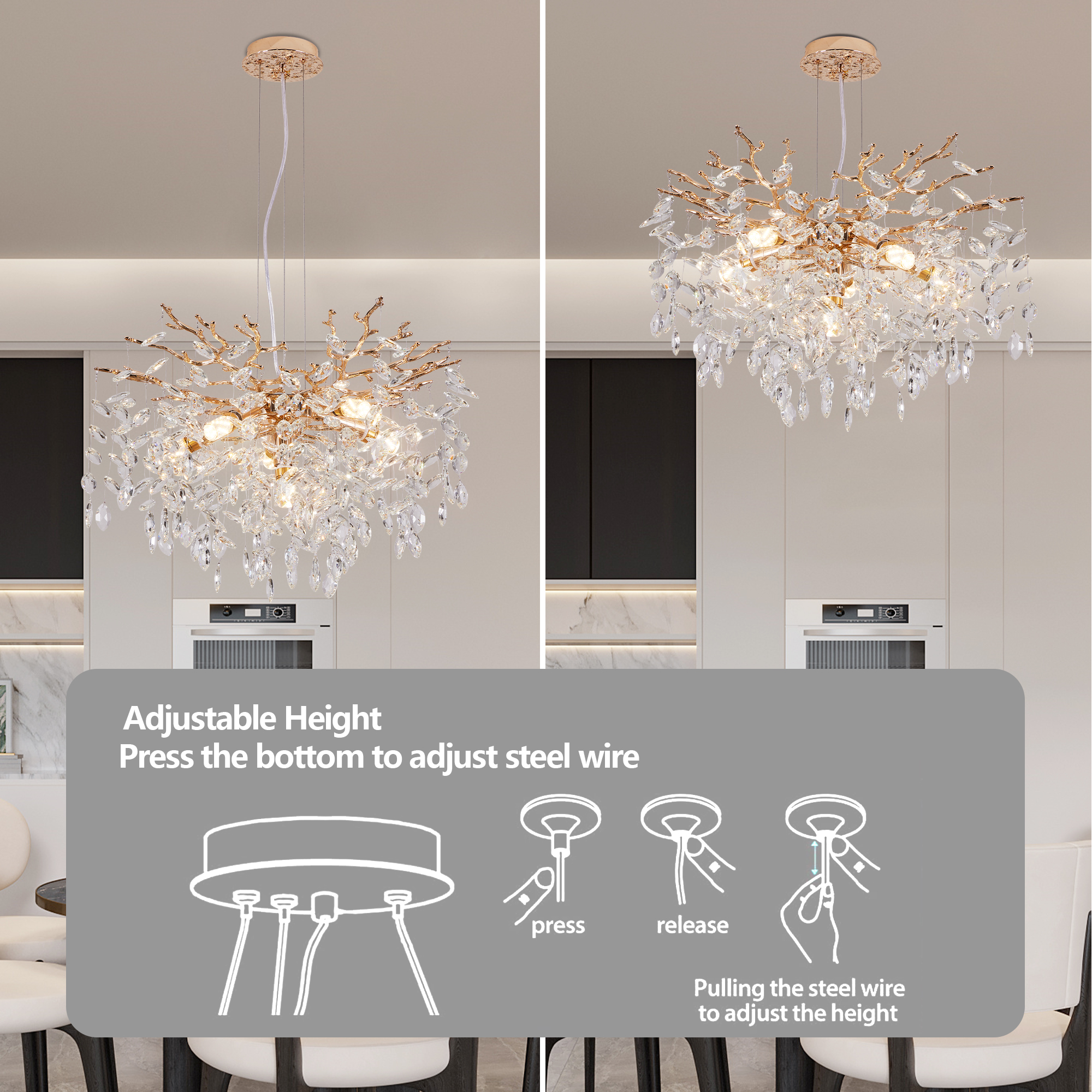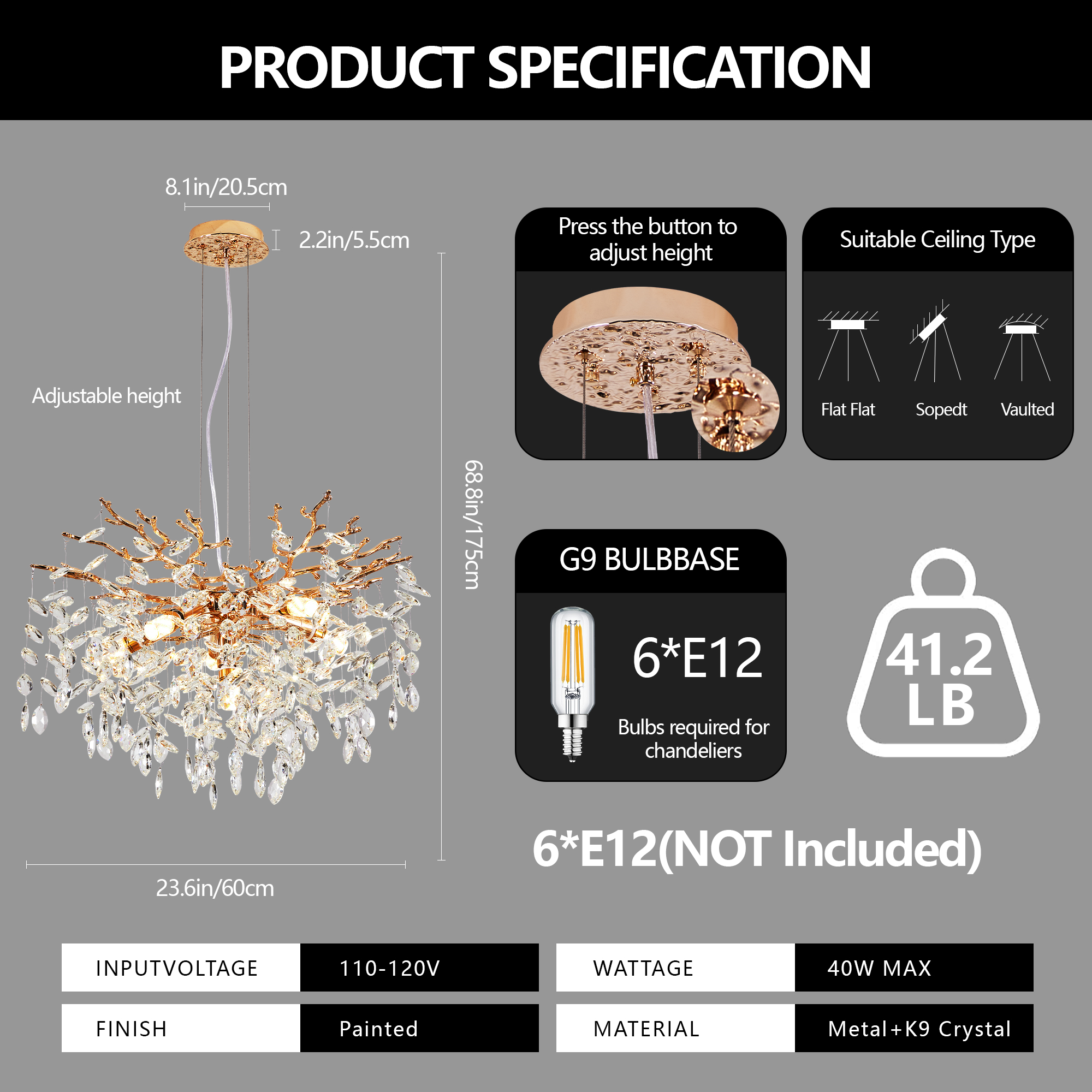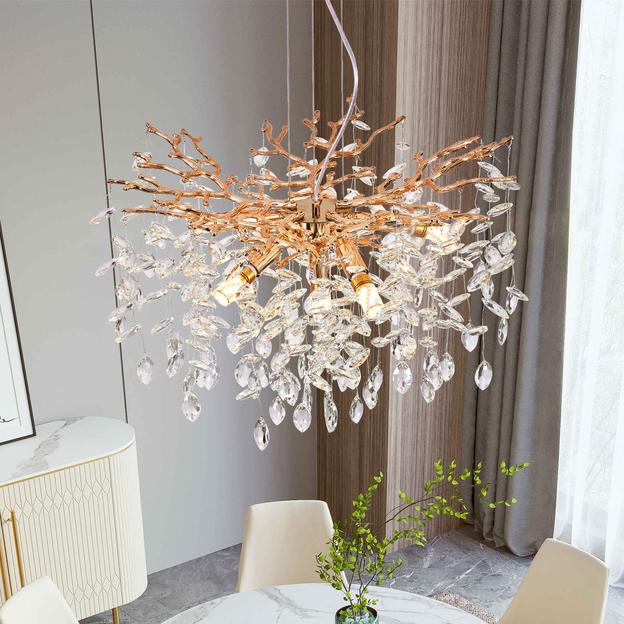 NEOSGO Modern Tree Branch Crystal Chandelier Luxury Gold Crystal Pendant Lighting 23.6" Contemporary 6-Light Chandeliers for Dining Room Kitchen Bedroom Living Room is designed to serve as both a lighting source and a decorative focal point within the room. This type of fixture is especially effective above dining tables, in entryways, and in living spaces where the customer wants overhead light with stronger visual impact. The product presentation suggests a style-driven fixture that helps define the ceiling area and gives the space a more elevated, finished character. It is a strong fit for customers who want lighting that contributes to the overall look of the room rather than functioning as a utility piece alone. Overall size is approximately 18.9 x 15.7 x 7.9 inches with a listed weight of 17.1. The current listing includes 9 product images, which help clarify the product shape, proportions, and visual placement in a real room setting.