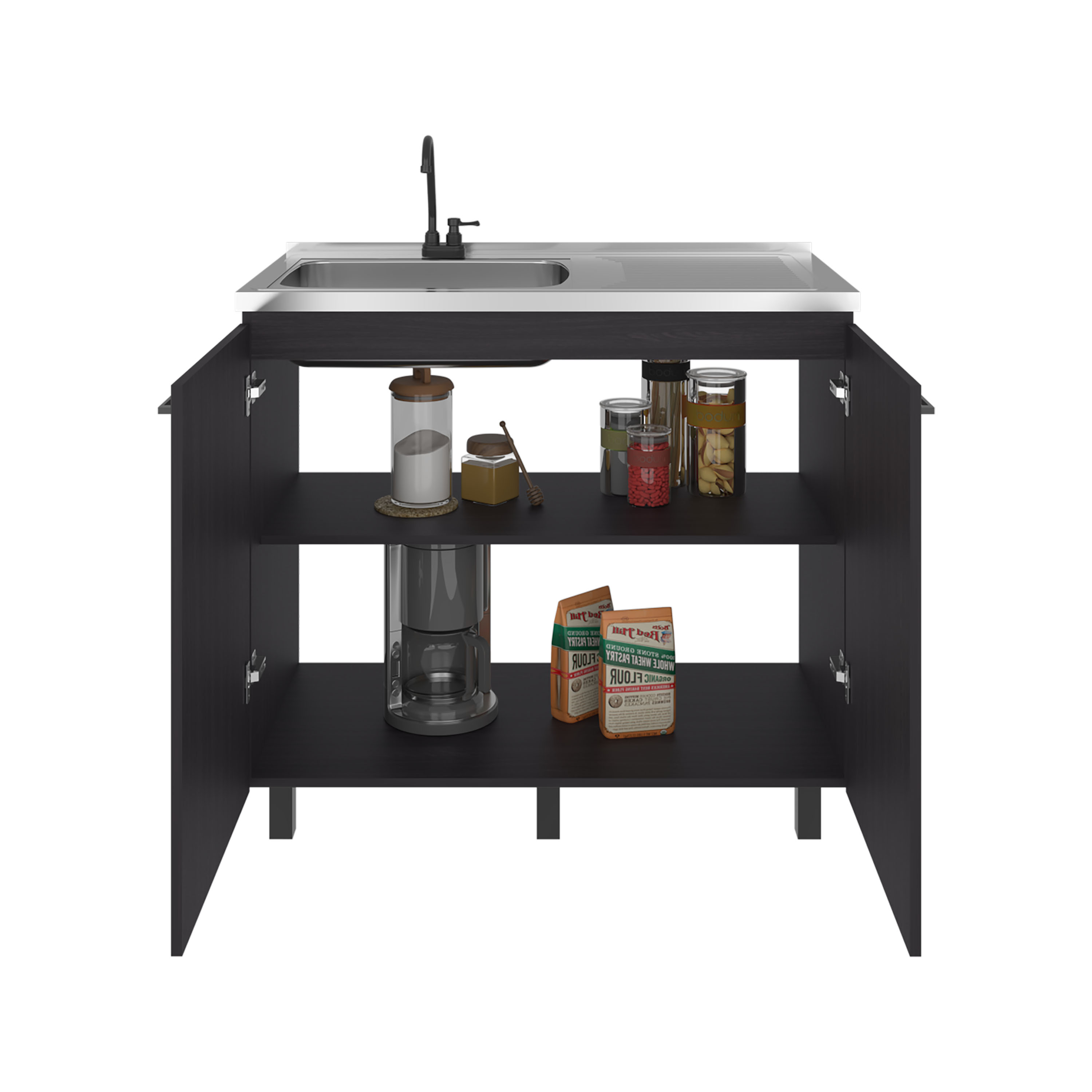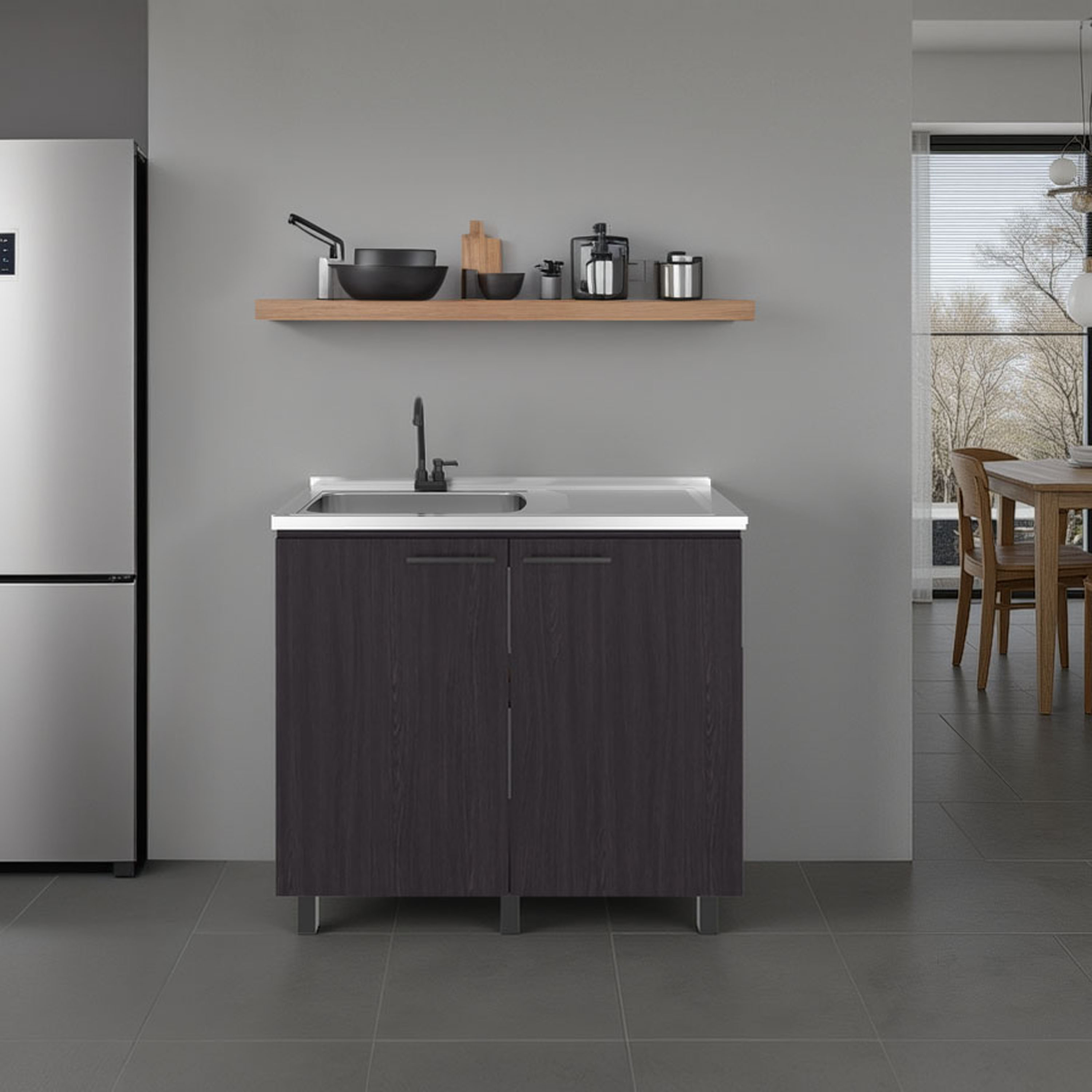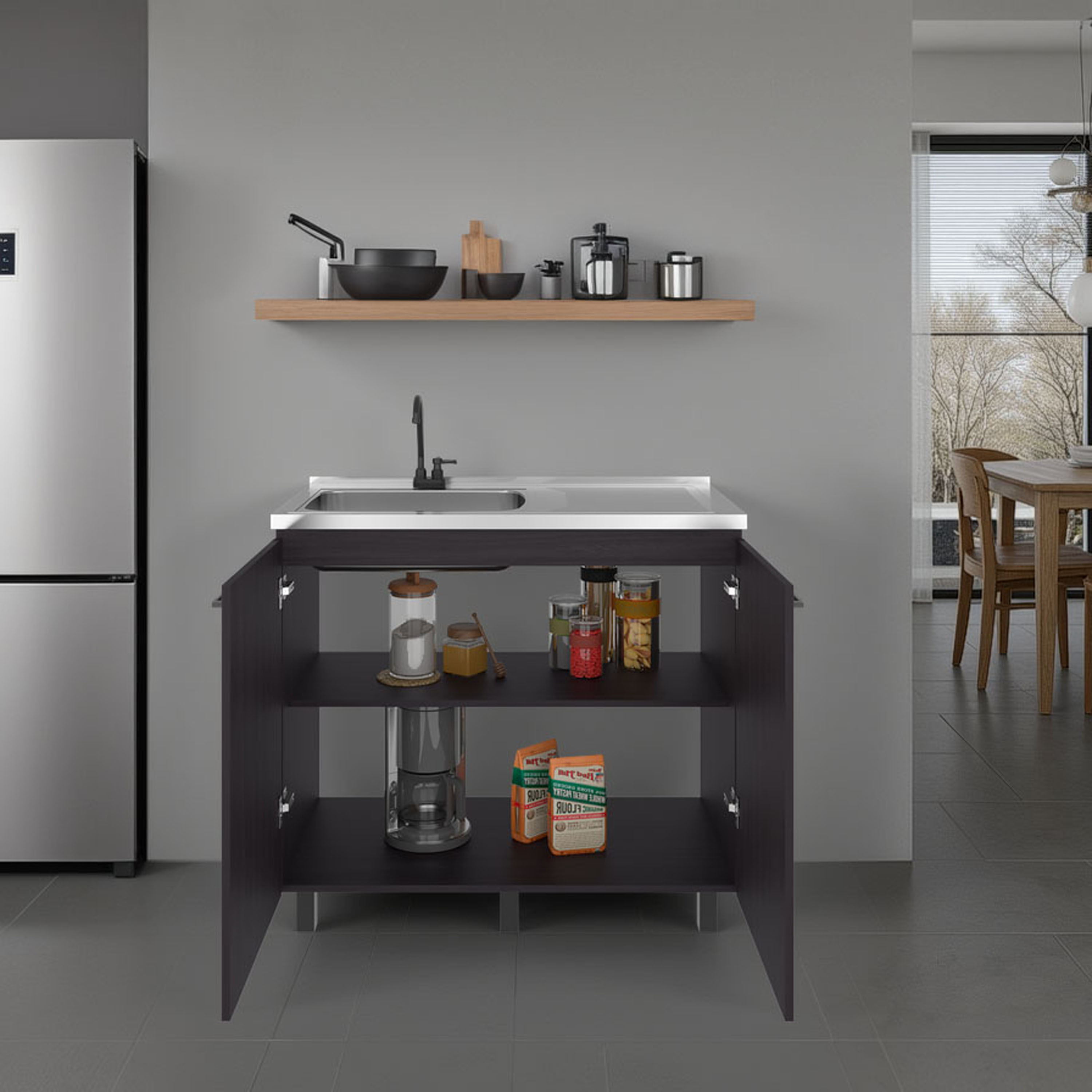 Napoles Utility Sink with Faucet Inclued and Integrated Stainless Steel Counter top, Freestanding cabinet with two doors, Metal Handles and Two interior shelves, Light Espresso