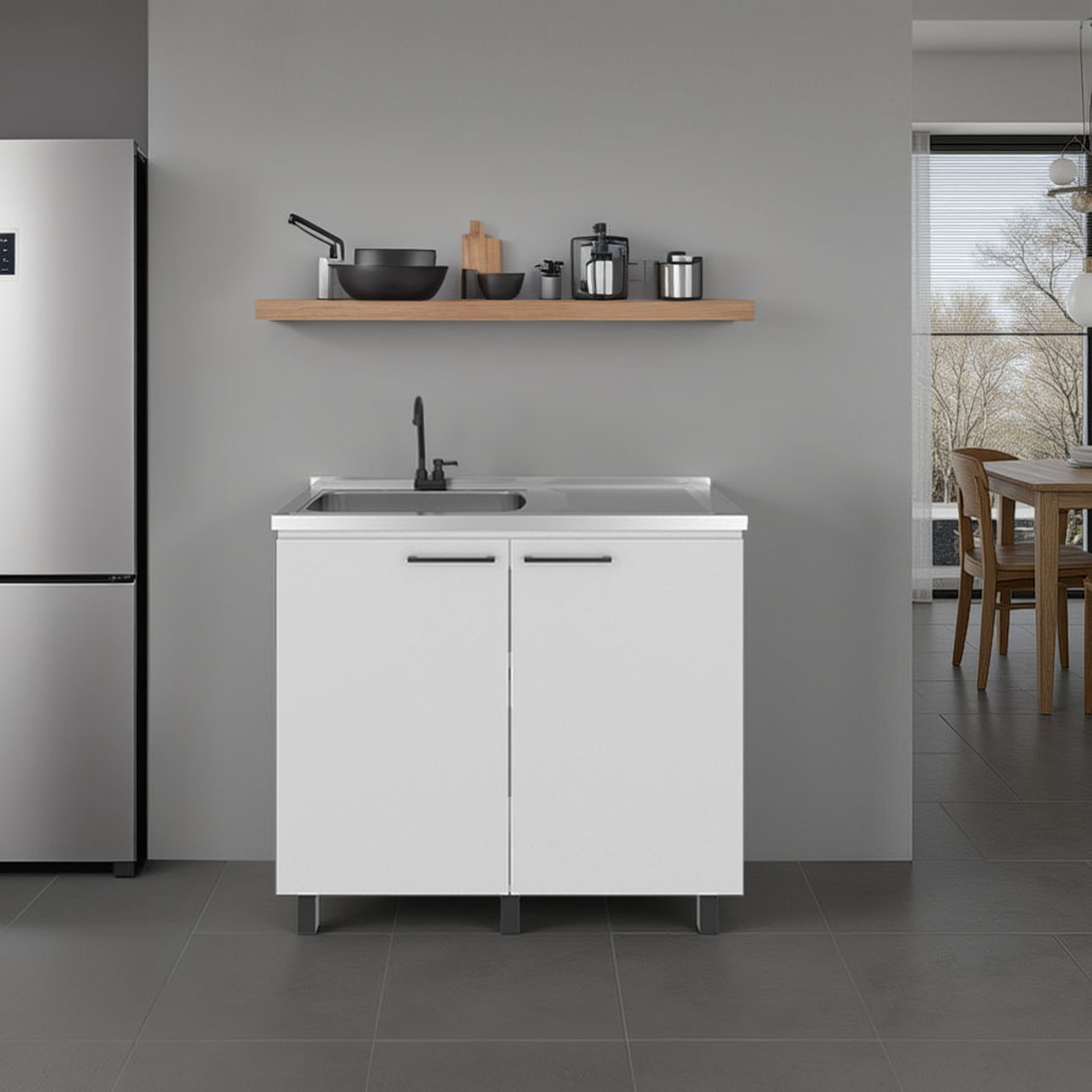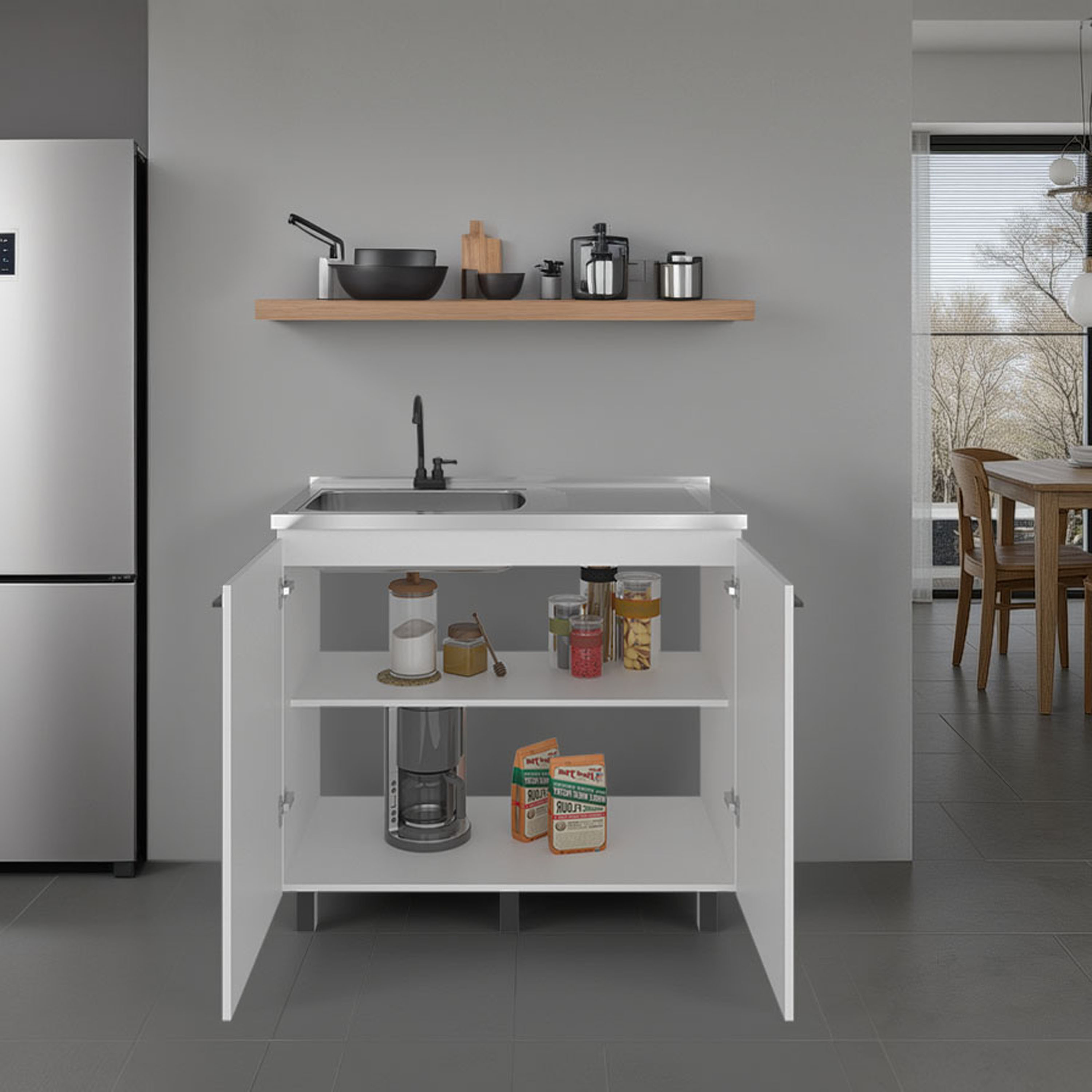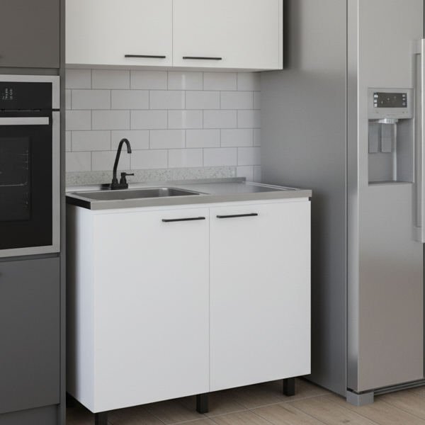Napoles Utility Sink with Faucet Inclued and Integrated Stainless Steel Counter top, Freestanding cabinet with two doors, Metal Handles and Two interior shelves, White