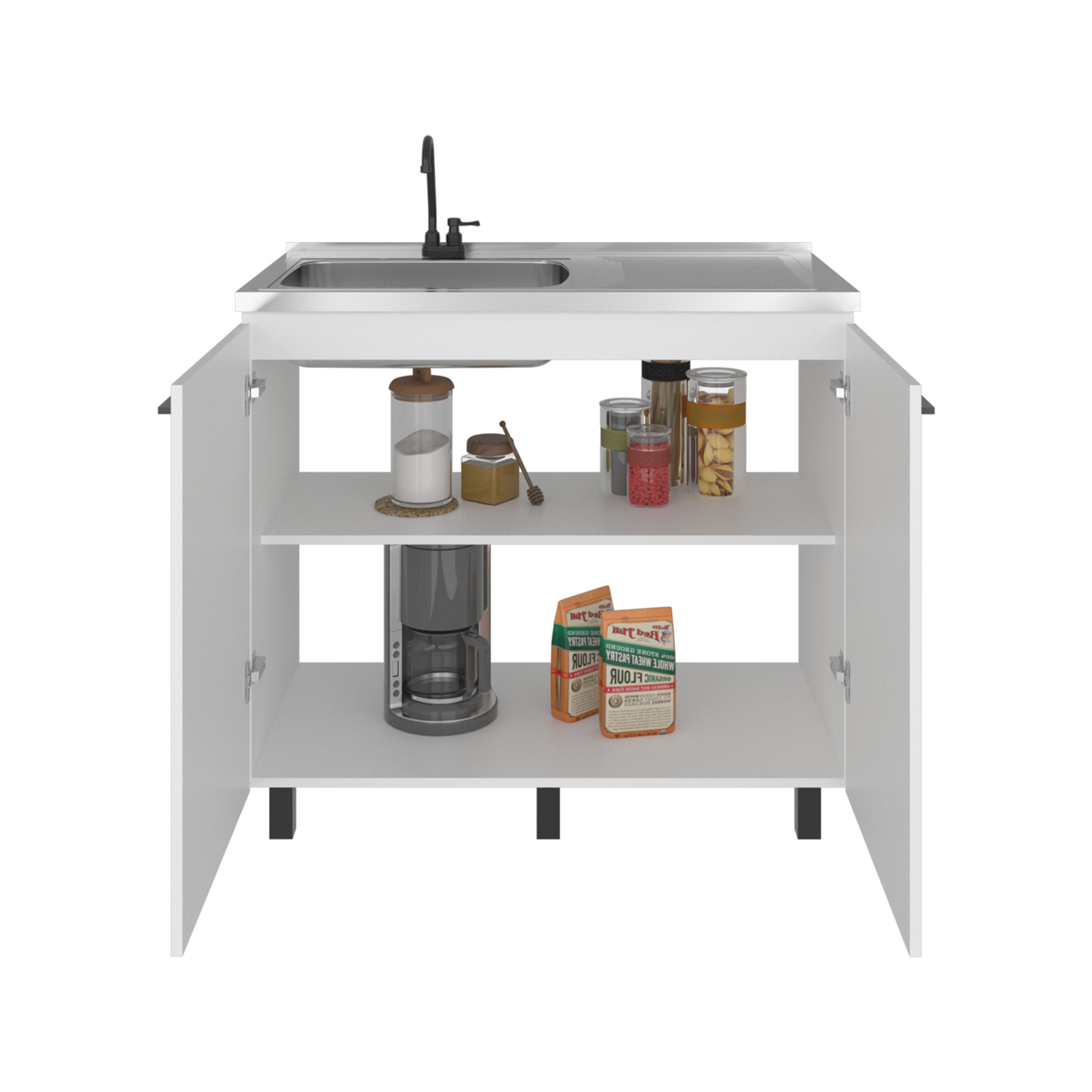 Napoles Utility Sink with Faucet Inclued and Integrated Stainless Steel Counter top, Freestanding cabinet with two doors, Metal Handles and Two interior shelves, White