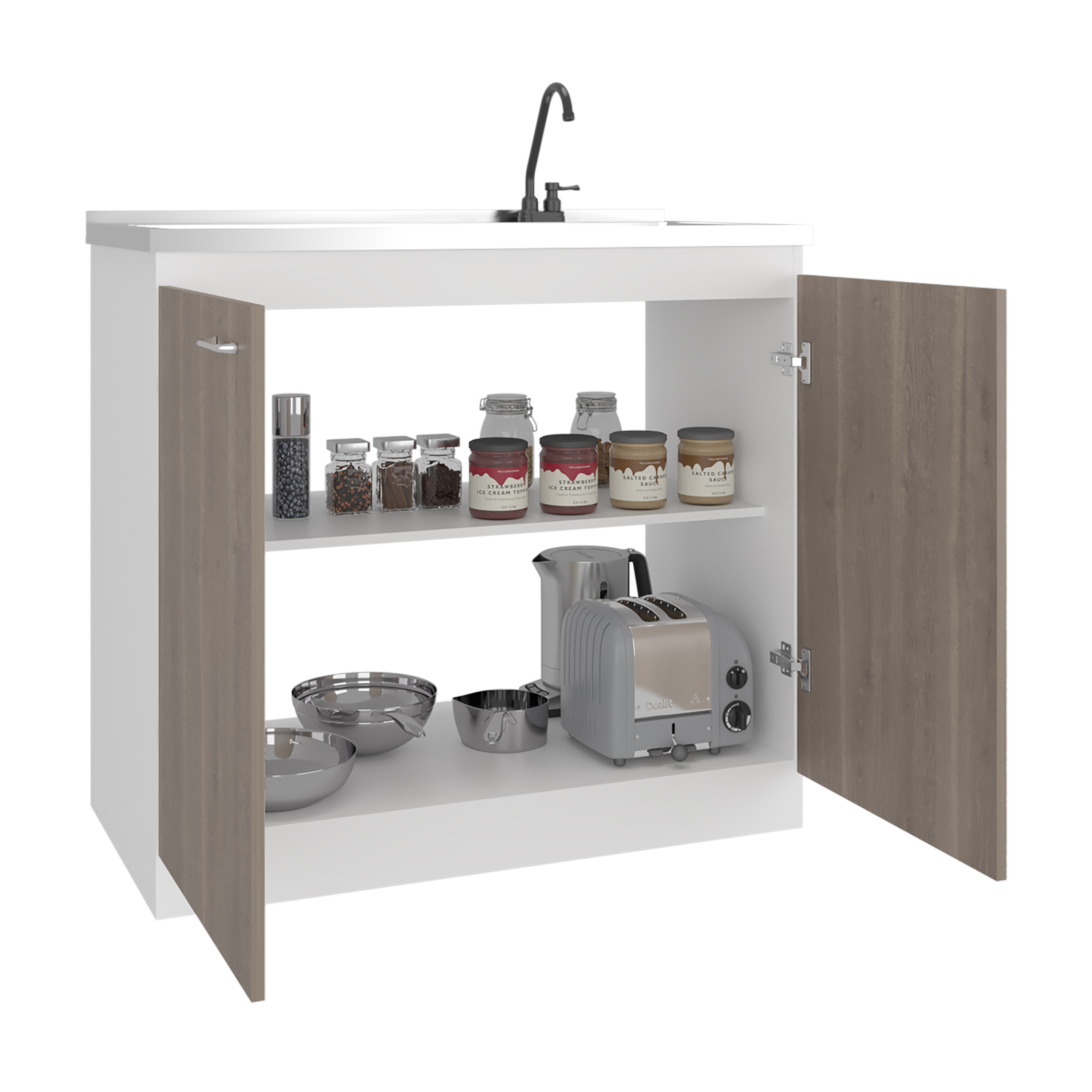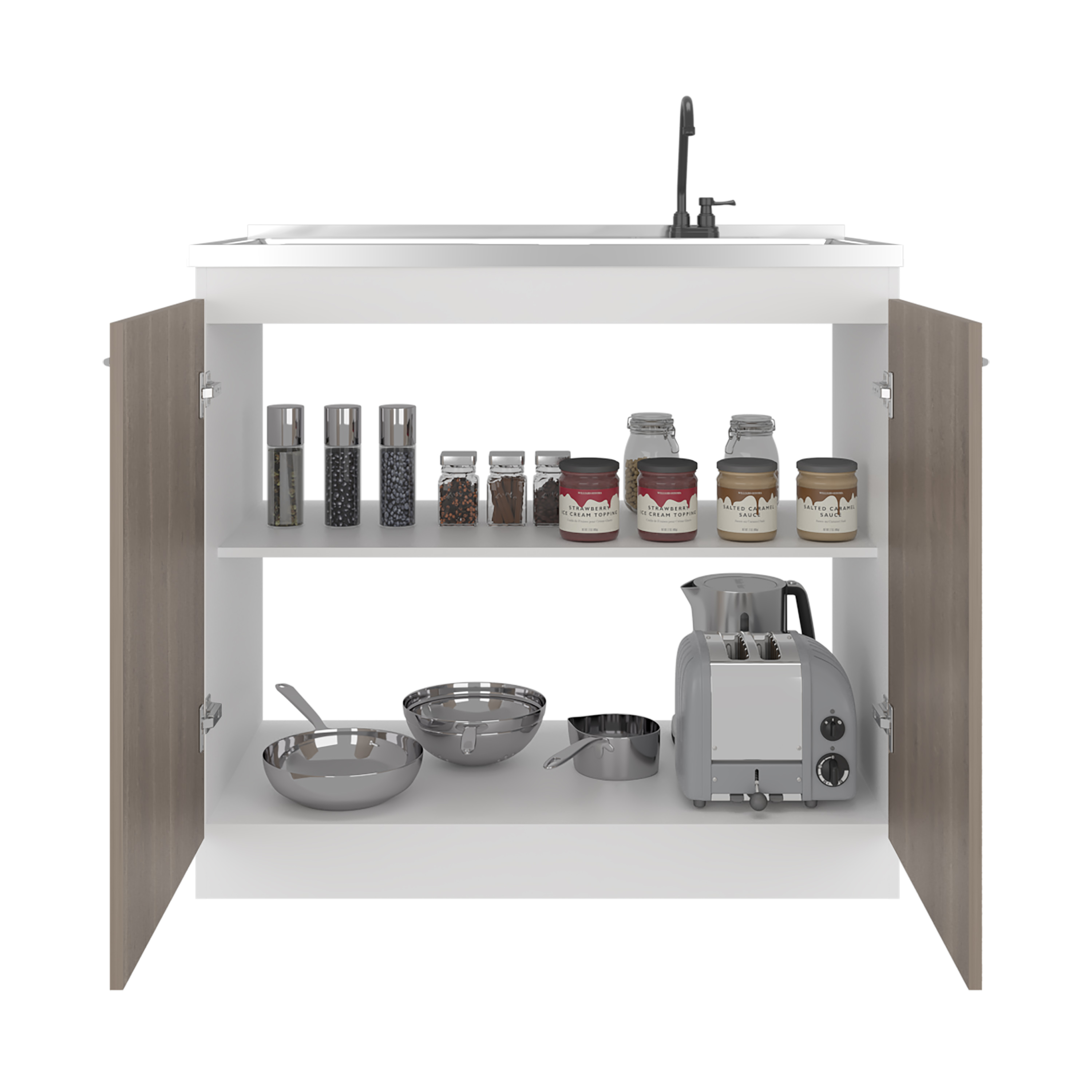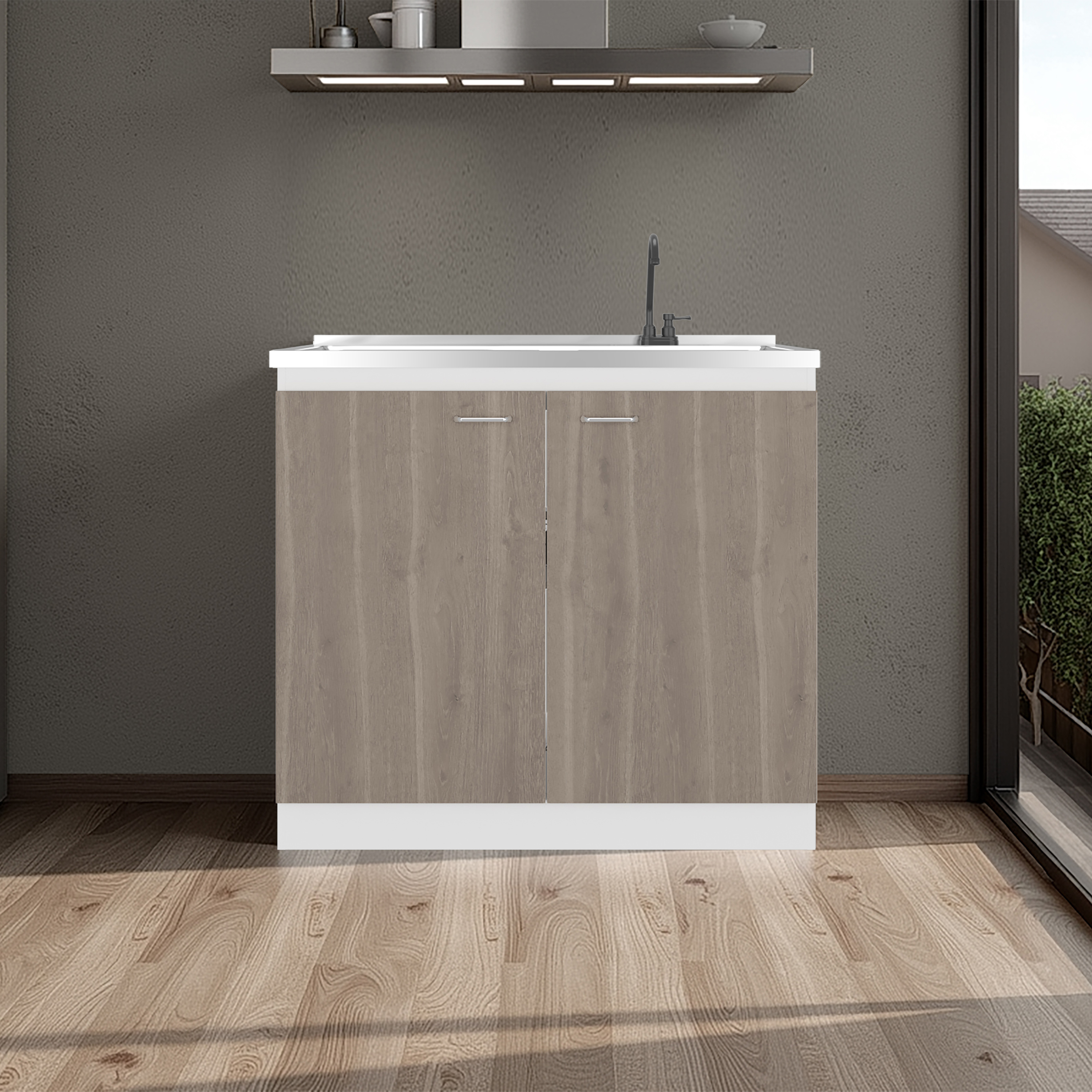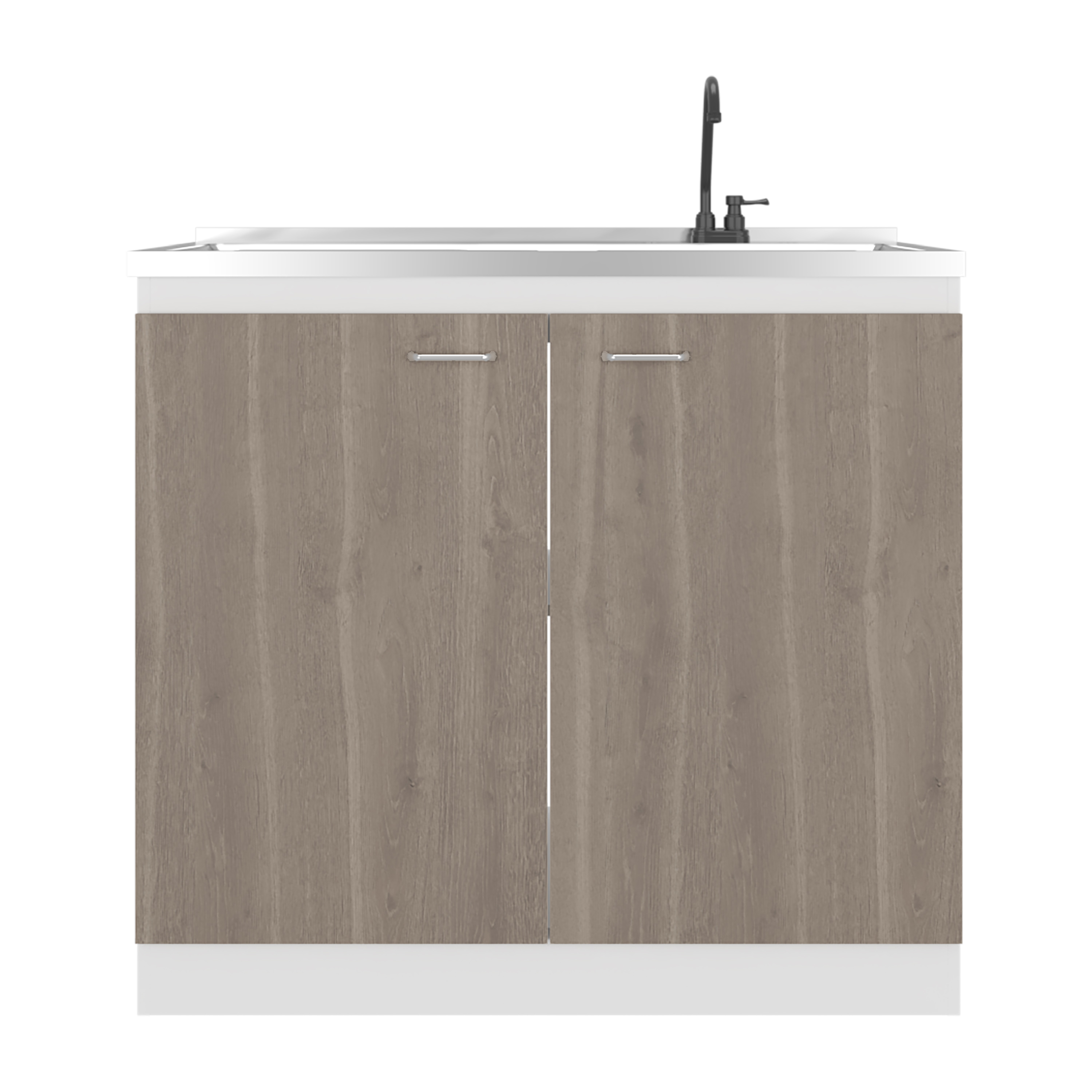 Napoles Utility Sink with Faucet Inclued and Integrated Stainless Steel Counter top, Freestanding cabinet with two doors, Metal Handles and Two interior shelves, Gray+White