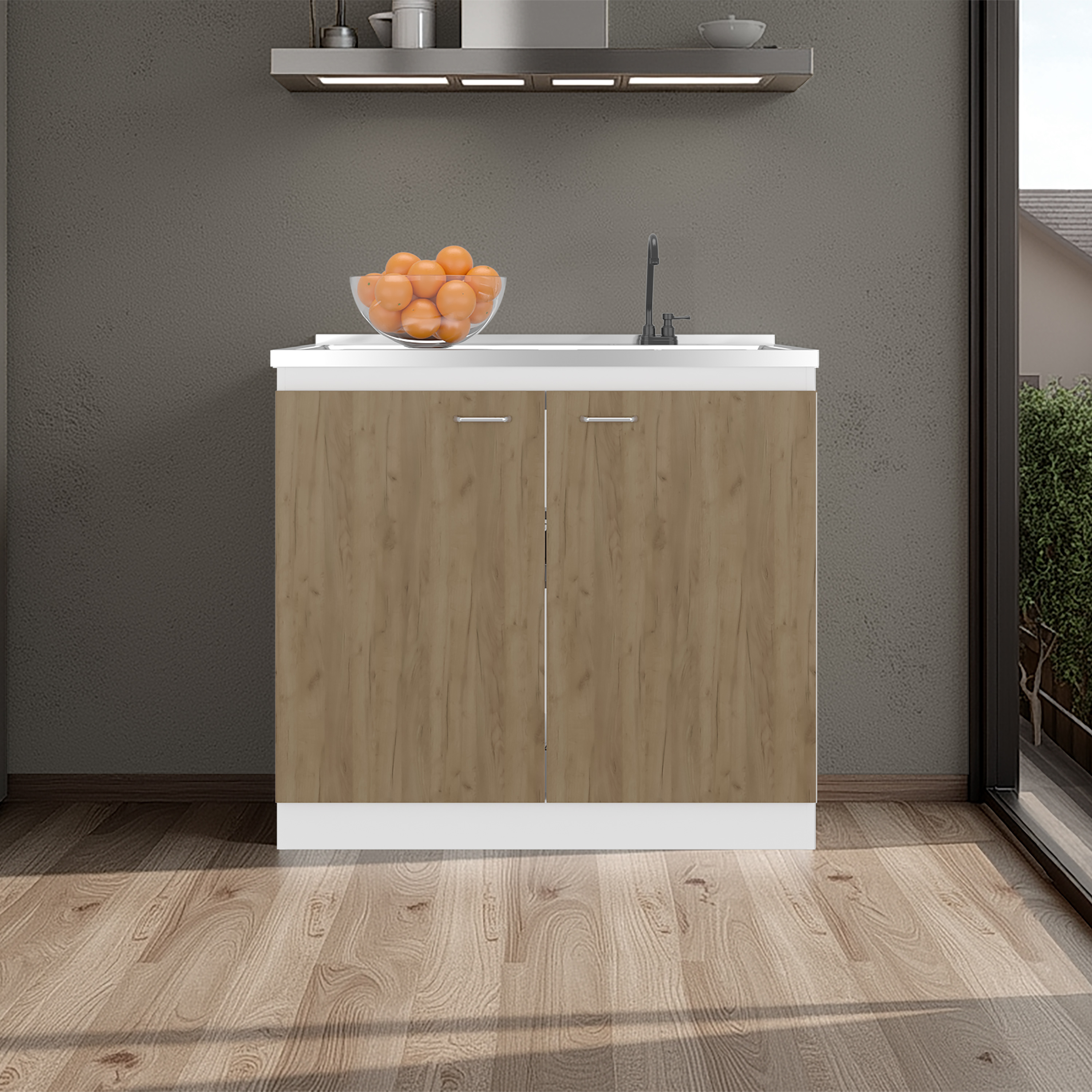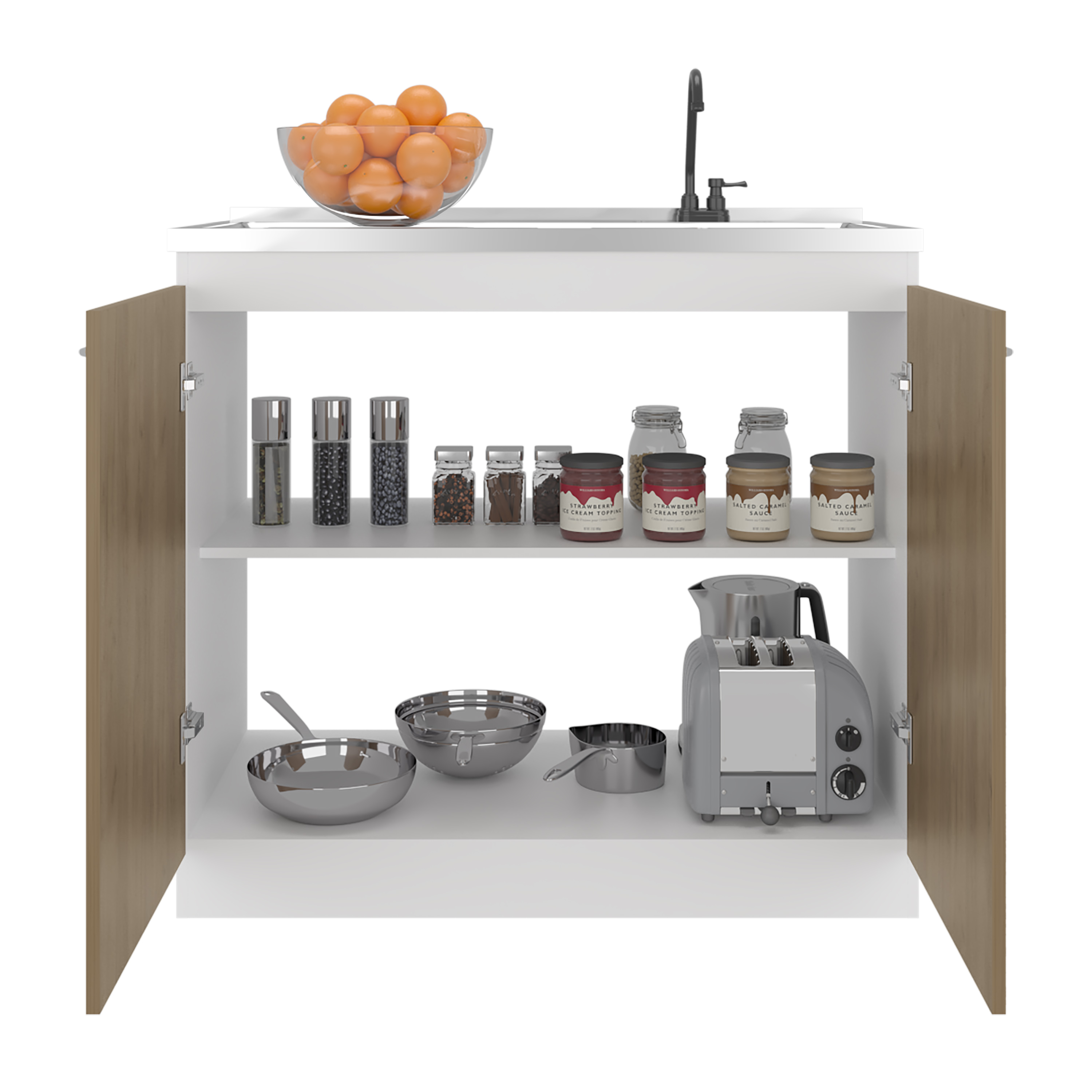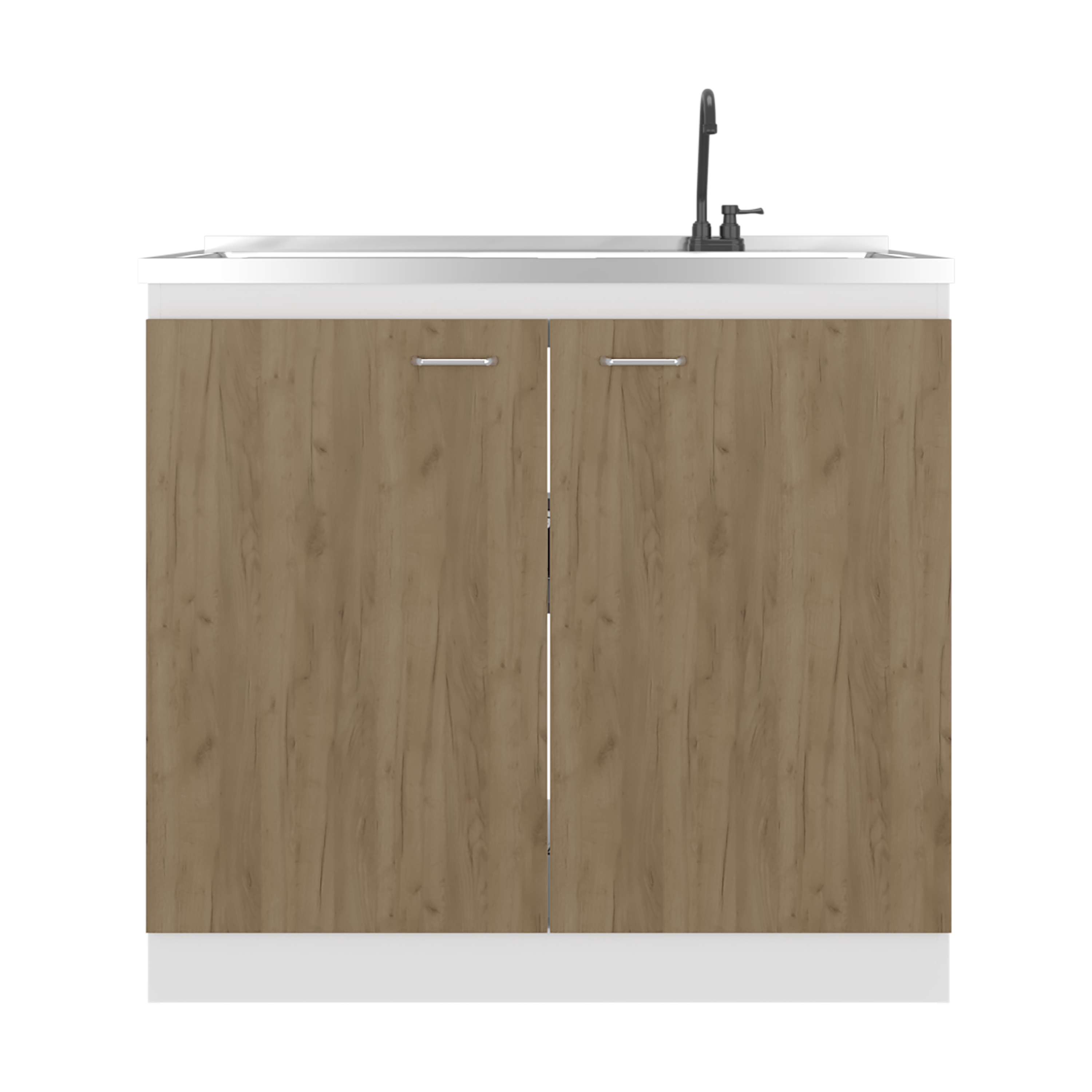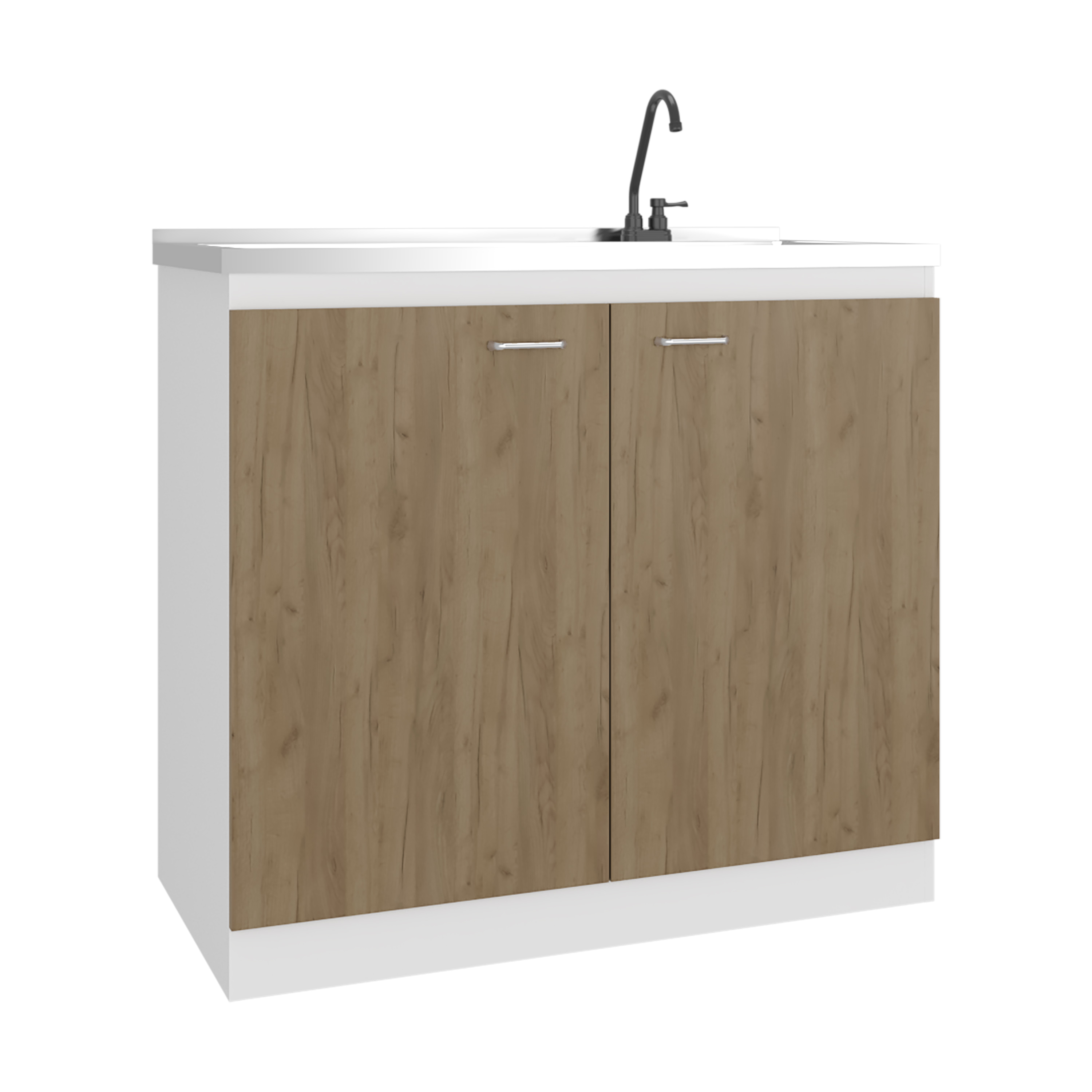 Napoles Utility Sink with Faucet Inclued and Integrated Stainless Steel Counter top, Freestanding cabinet with two doors, Metal Handles and Two interior shelves, Natural+White