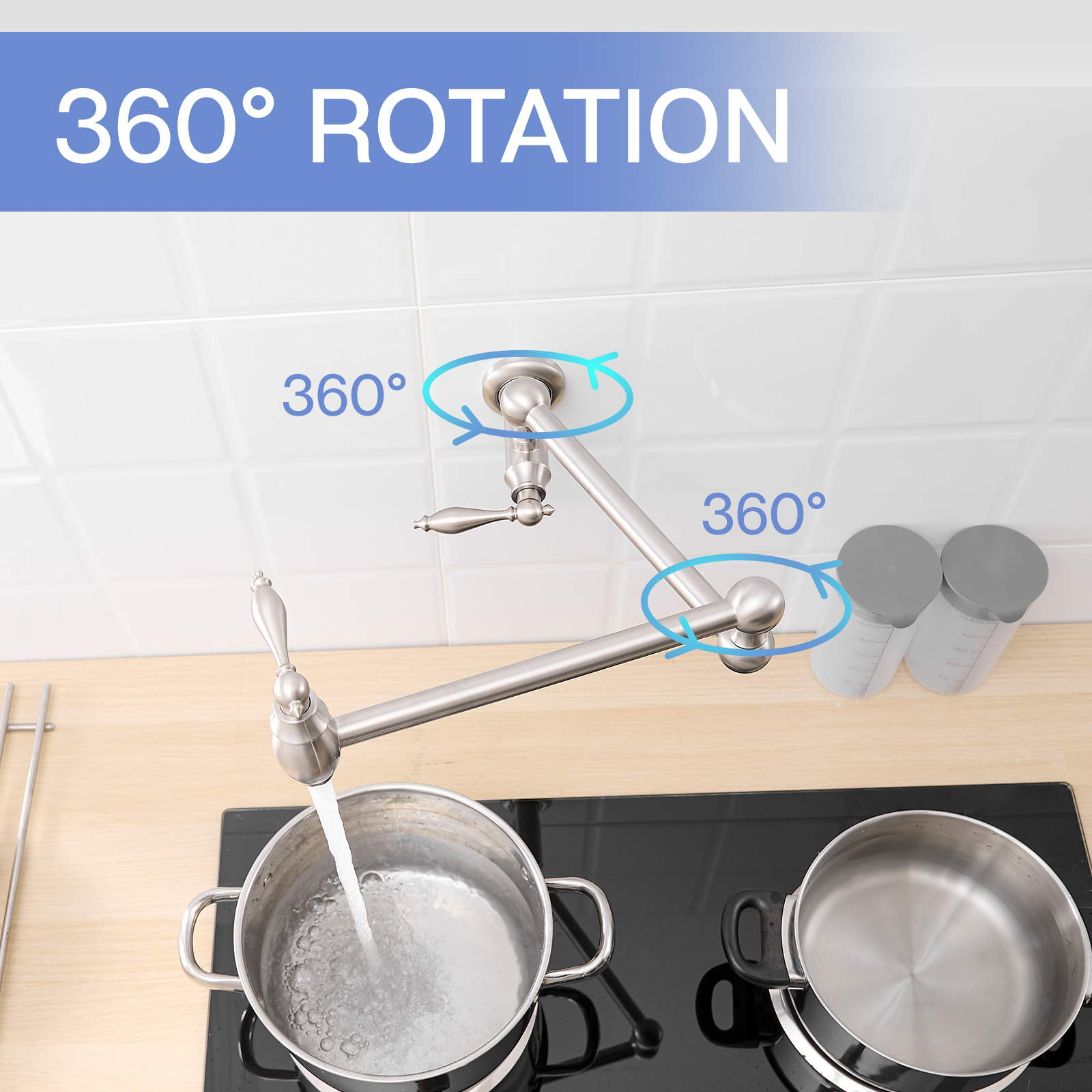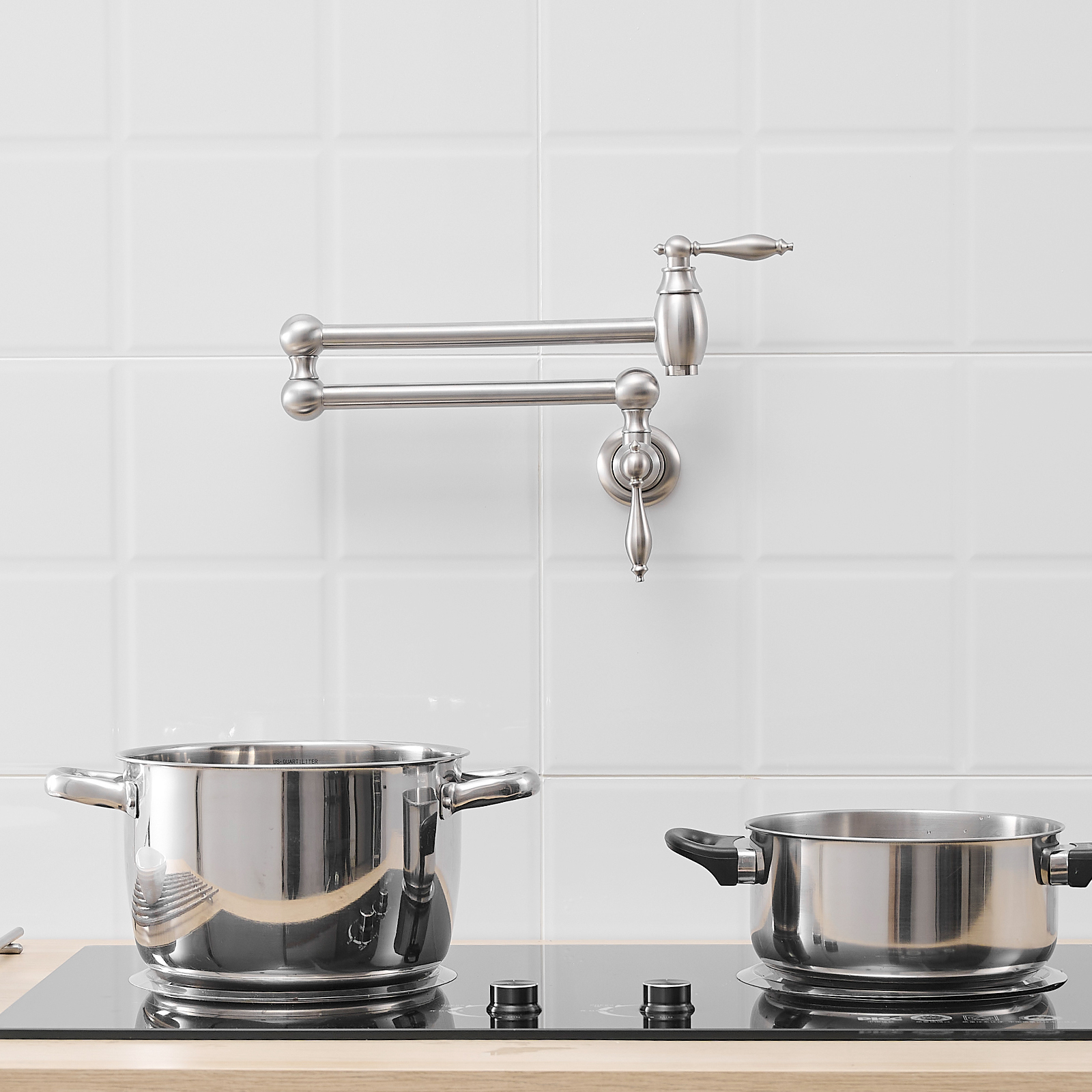 Wall mounted Pot Filler Faucet, Modern Brass Pot Filler Two-Attachment Wall Mount Folding Kitchen Pot Filler Swing Arm