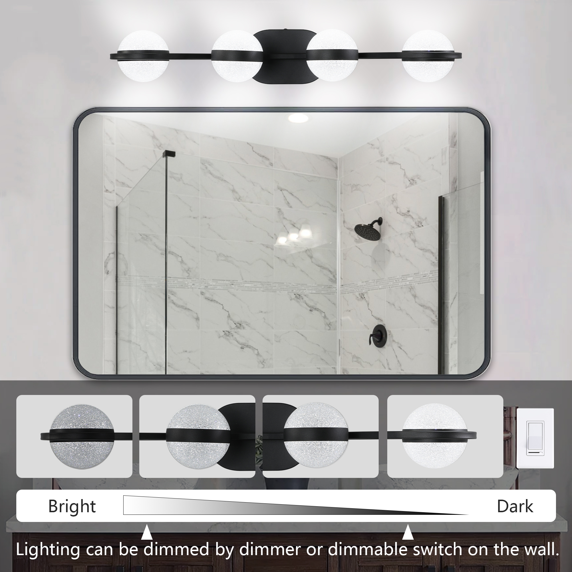 NEOSGO (Same as W1340P143677/L2001-B-4) 30" Black Minimalist LED Bathroom Vanity Light with Crystal Sand Acrylic Shades, 4-Light Wall Mounted Decorative Lighting Fixture, Suitable for Bathroom Vanity Mirror is designed to improve daily bathroom routines with a clearer mirror area and more useful lighting around the vanity space. The product presentation suggests a modern wall-mounted mirror intended for grooming, makeup, skincare, shaving, and other tasks that benefit from more even front-facing light. It works especially well in bathrooms, powder rooms, and remodeled vanity areas where customers want the mirror to provide both practical function and a cleaner visual upgrade. This type of mirror is a strong fit for shoppers looking to make the room feel brighter, more modern, and easier to use every day. Overall size is approximately 31.9 x 9.4 x 7.5 inches with a listed weight of 6.3. The current listing includes 8 product images, which help clarify the product shape, proportions, and visual placement in a real room setting.