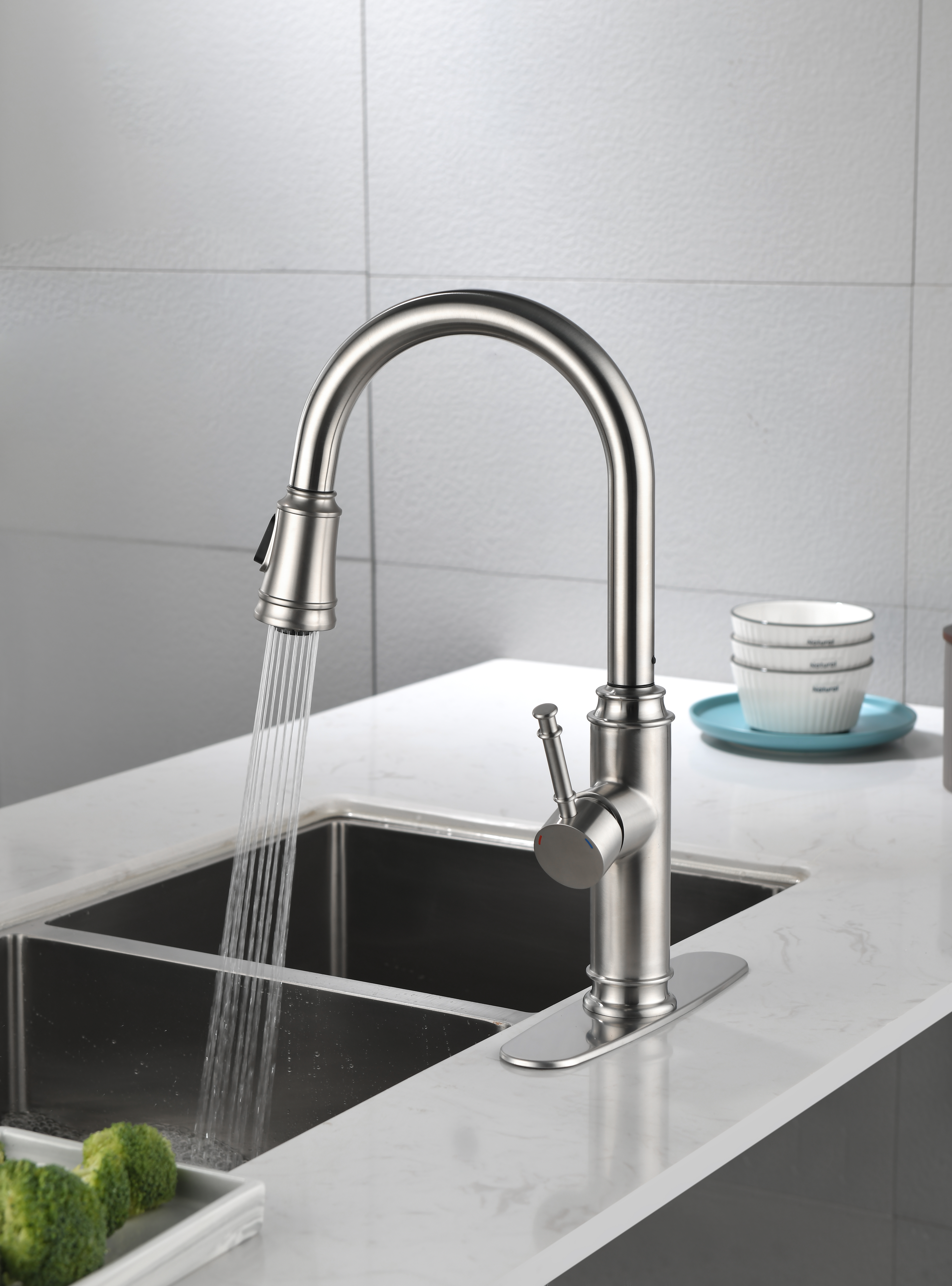 W2287 Single Handle High Arc Pull Out Kitchen Faucet,Single Level Stainless Steel Kitchen Sink Faucets with Pull Down Sprayer. Designed as a practical decorative lighting piece that supports everyday use while helping complete the look of the space. Material: Stainless Steel. Product dimensions and weight: length 25, width 10.3, height 2.5, weight 6.