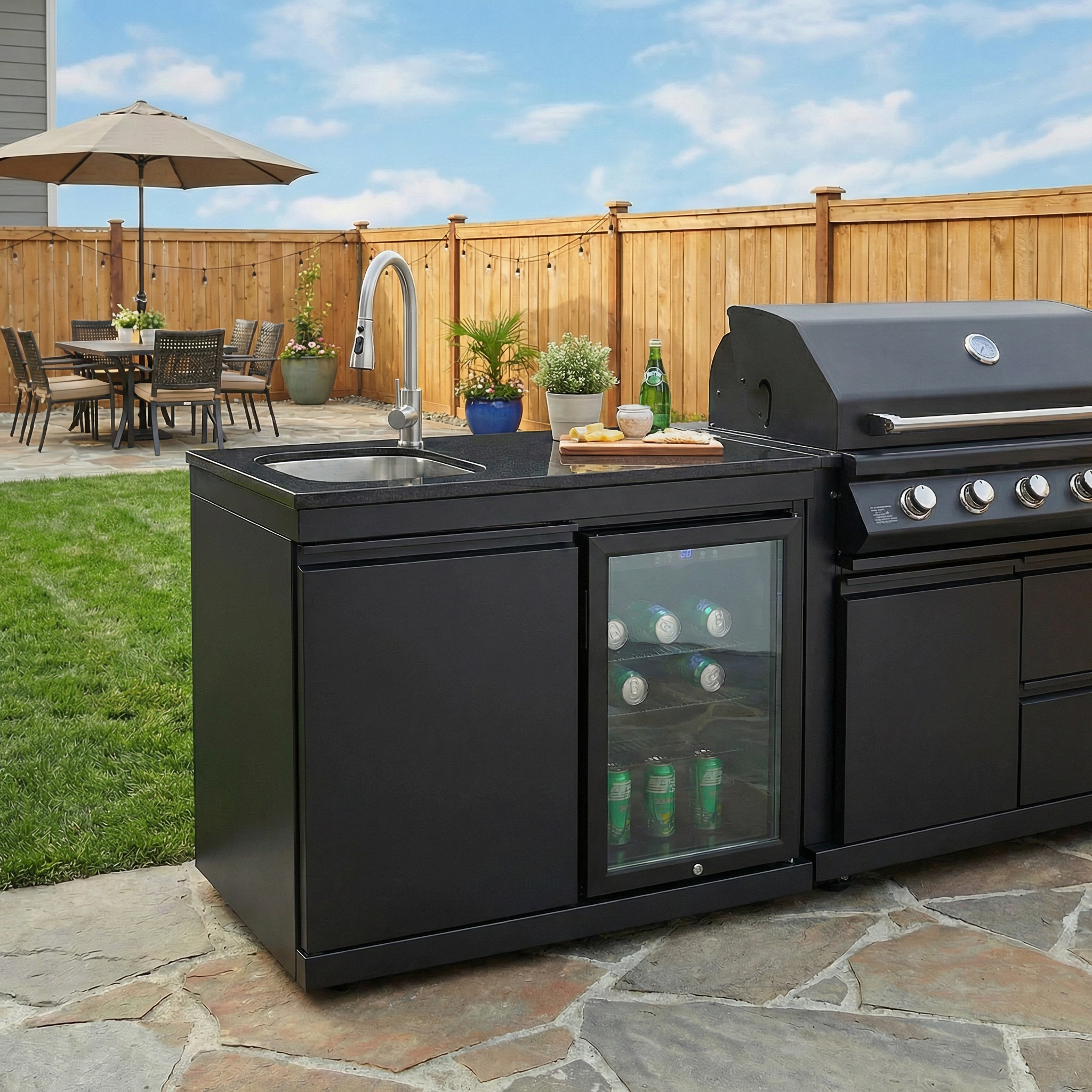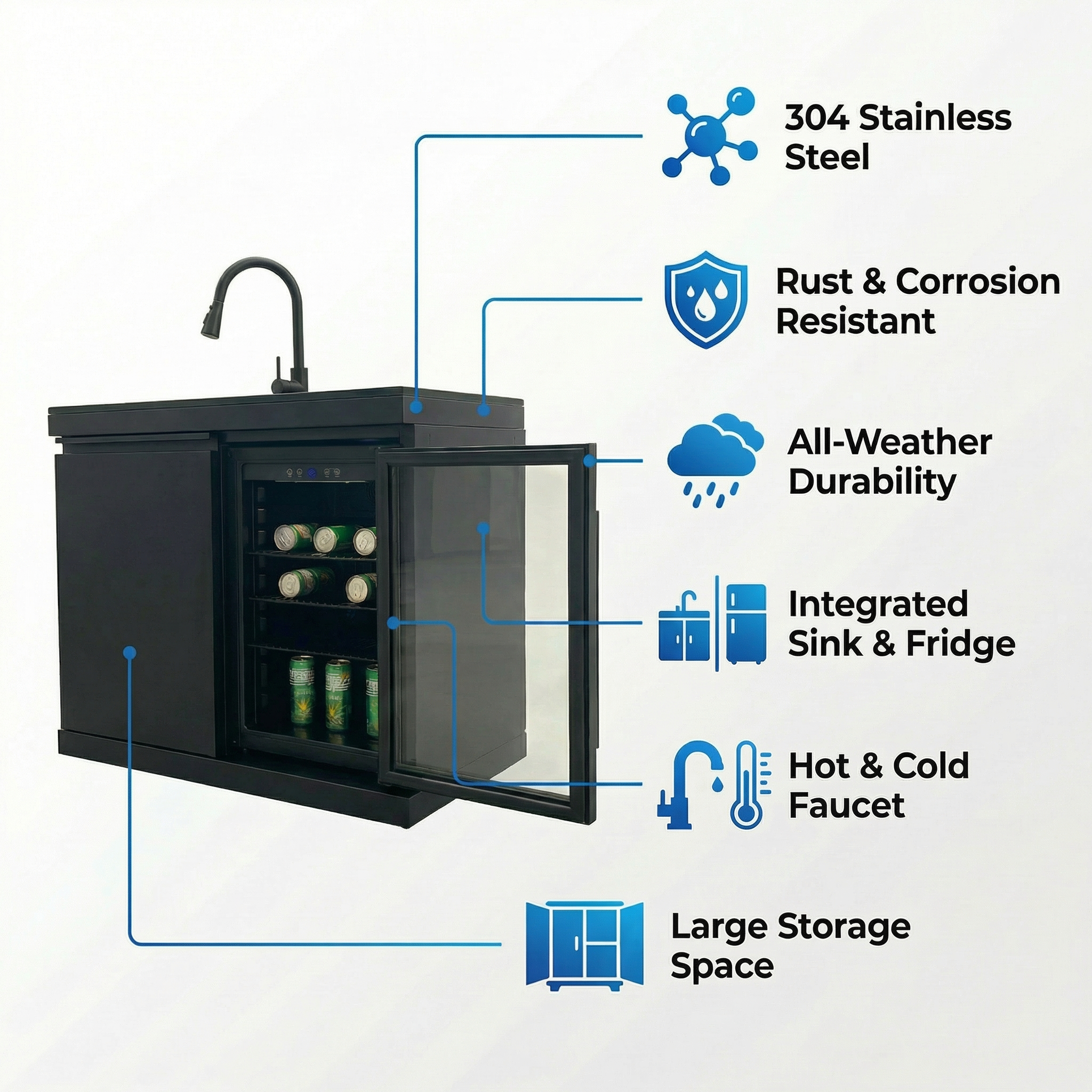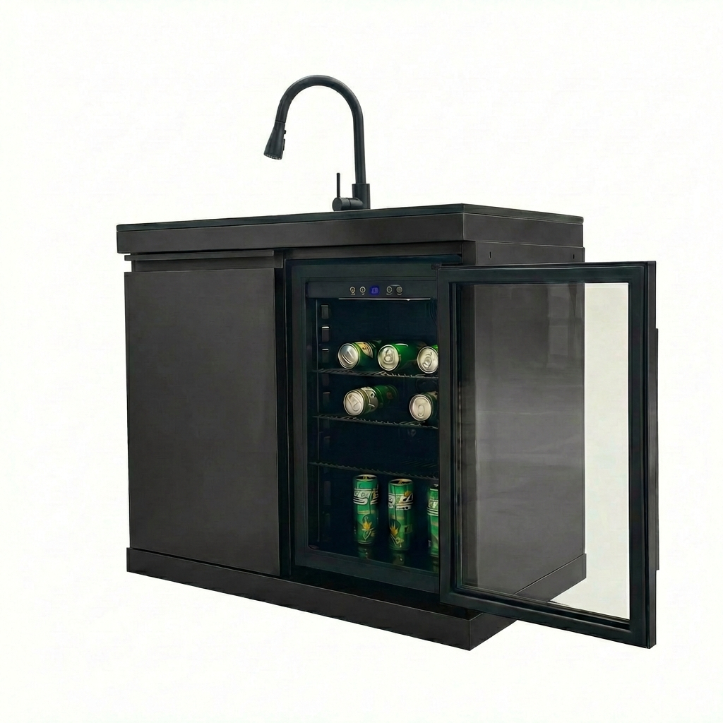 Fuente Sink and Fridge Combo for Outdoor Kitchen, 70L Refrigerator and Sink with Pull-Down Faucet, Brushed SS and Black Granite Countertops, All-in-One BBQ Island Cleaning Station (Black). Intended to add dependable illumination and a finished look to exterior doors, porches, patios, or other outdoor areas. Material: Stainless Steel. Product dimensions and weight: length 40.55, width 25.59, height 41.34, weight 244.2.