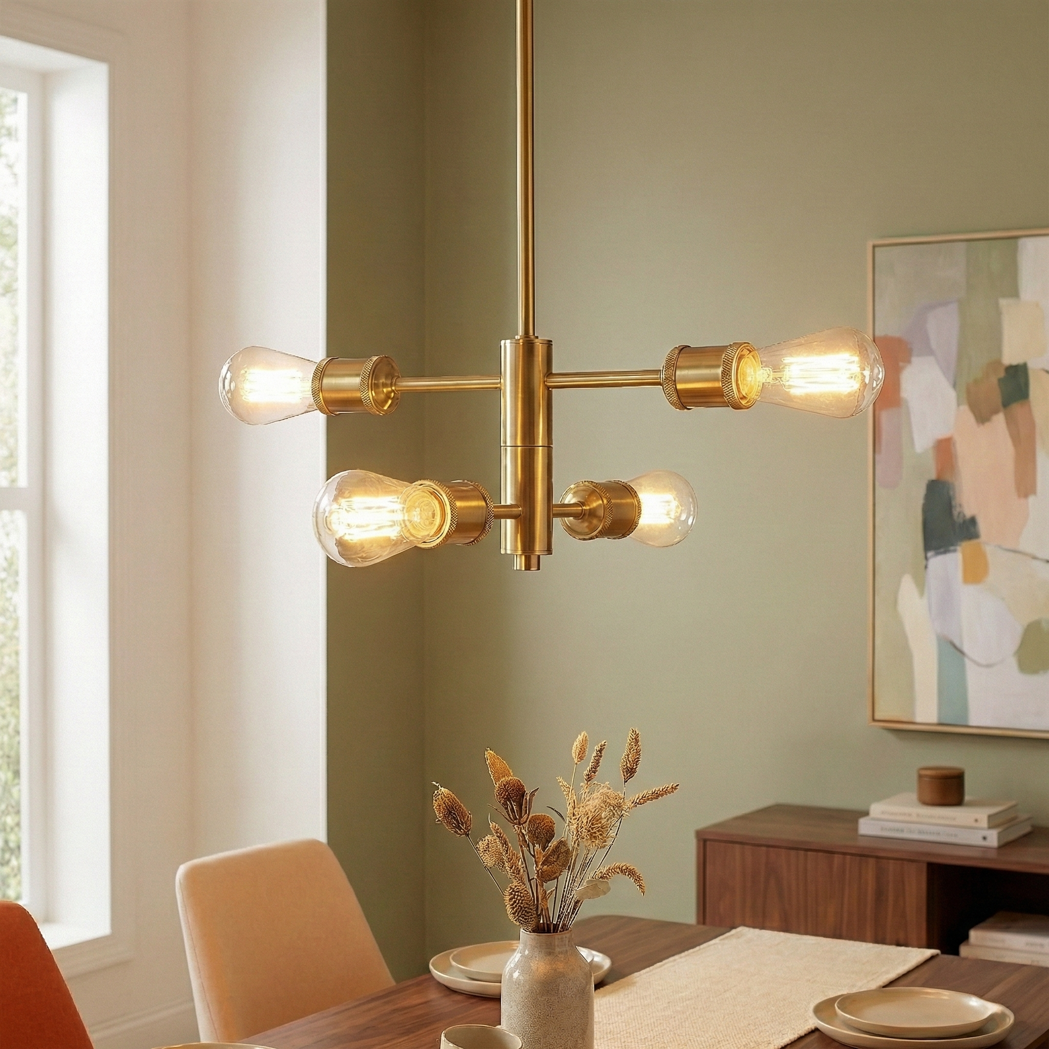 NEOSGO Trellis Four Lights Modern Gold Chandelier Vintage Pendant Fixture for Living Room Dining Kitchen 15"W × 6.75"H is designed to serve as both a lighting source and a decorative focal point within the room. This type of fixture is especially effective above dining tables, in entryways, and in living spaces where the customer wants overhead light with stronger visual impact. The product presentation suggests a style-driven fixture that helps define the ceiling area and gives the space a more elevated, finished character. It is a strong fit for customers who want lighting that contributes to the overall look of the room rather than functioning as a utility piece alone. Overall size is approximately 9 x 4.5 x 16.8 inches with a listed weight of 4. The current listing includes 7 product images, which help clarify the product shape, proportions, and visual placement in a real room setting.