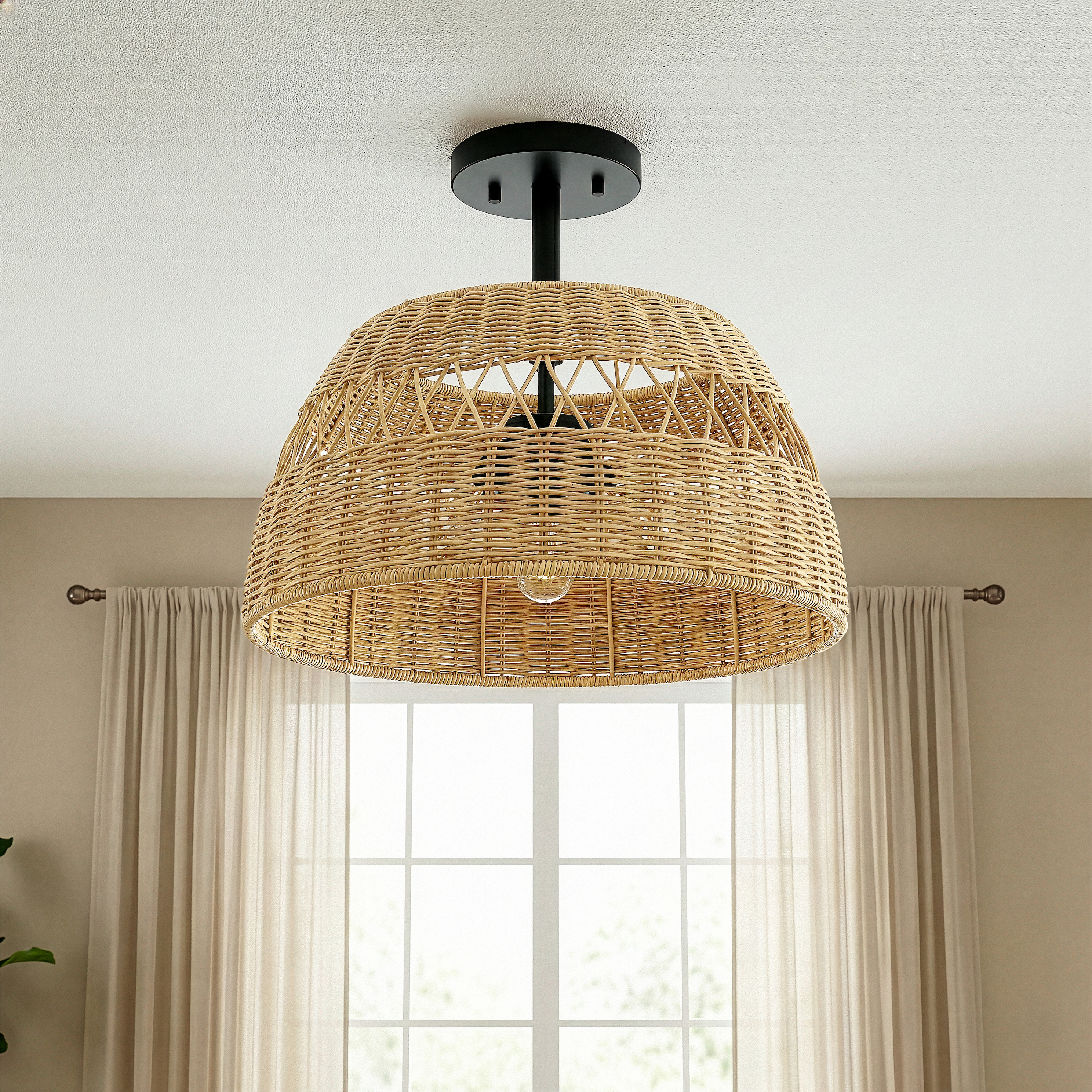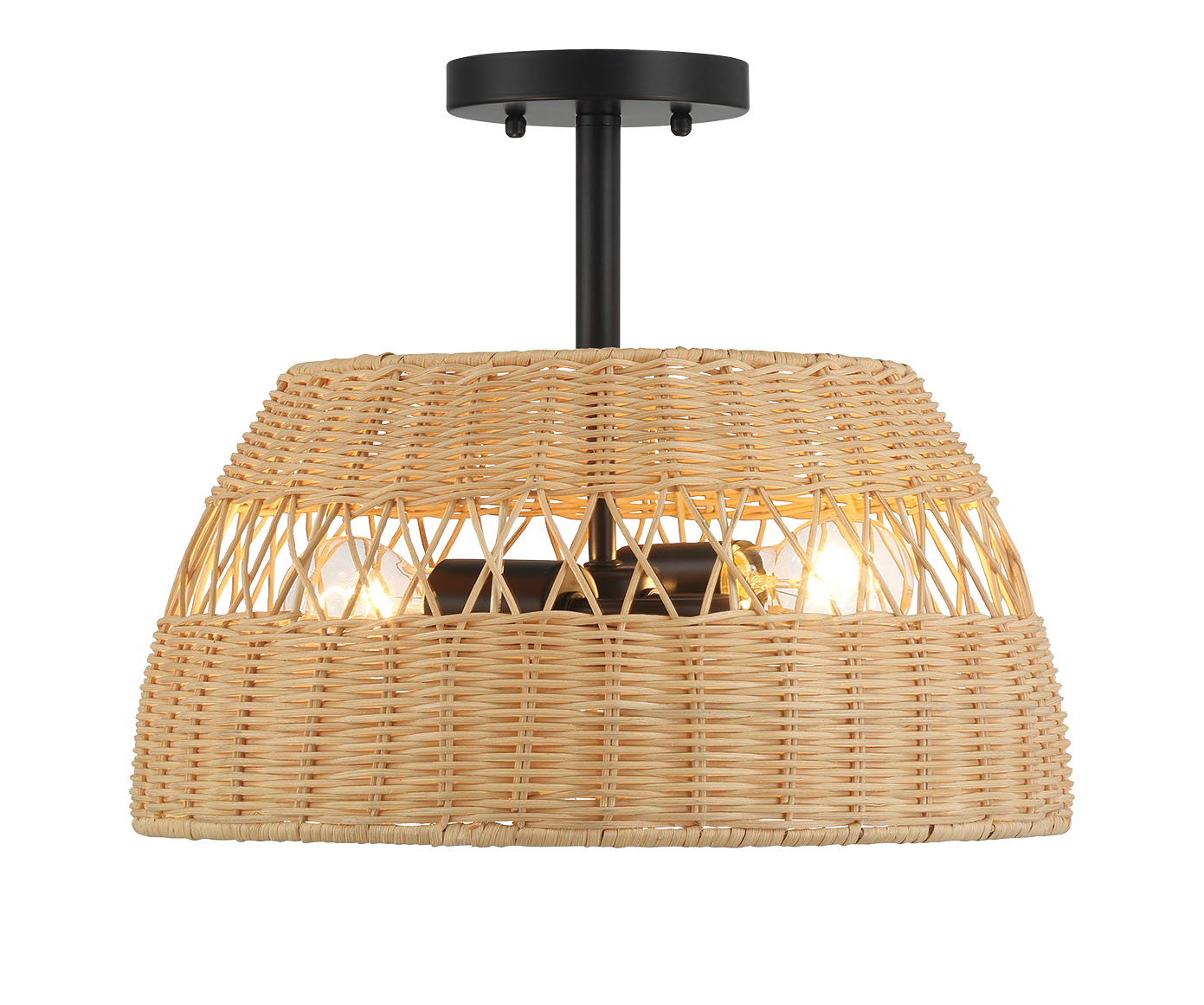 Twinkle Double Lights Semi Flush with Rattan Shade Black Metal Finish for Farmhouse Style Decor 12.6"H x 15"W x 15"D