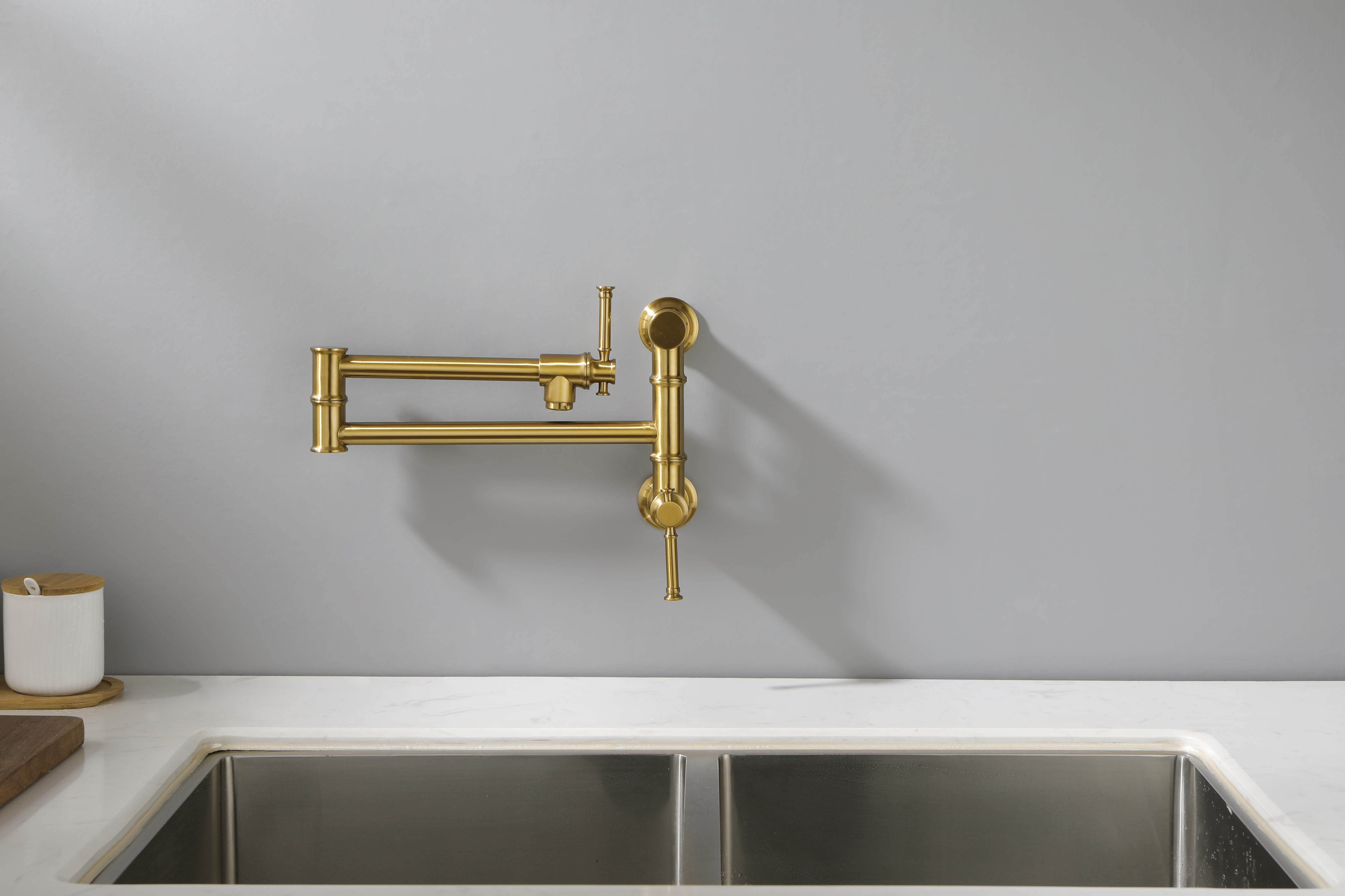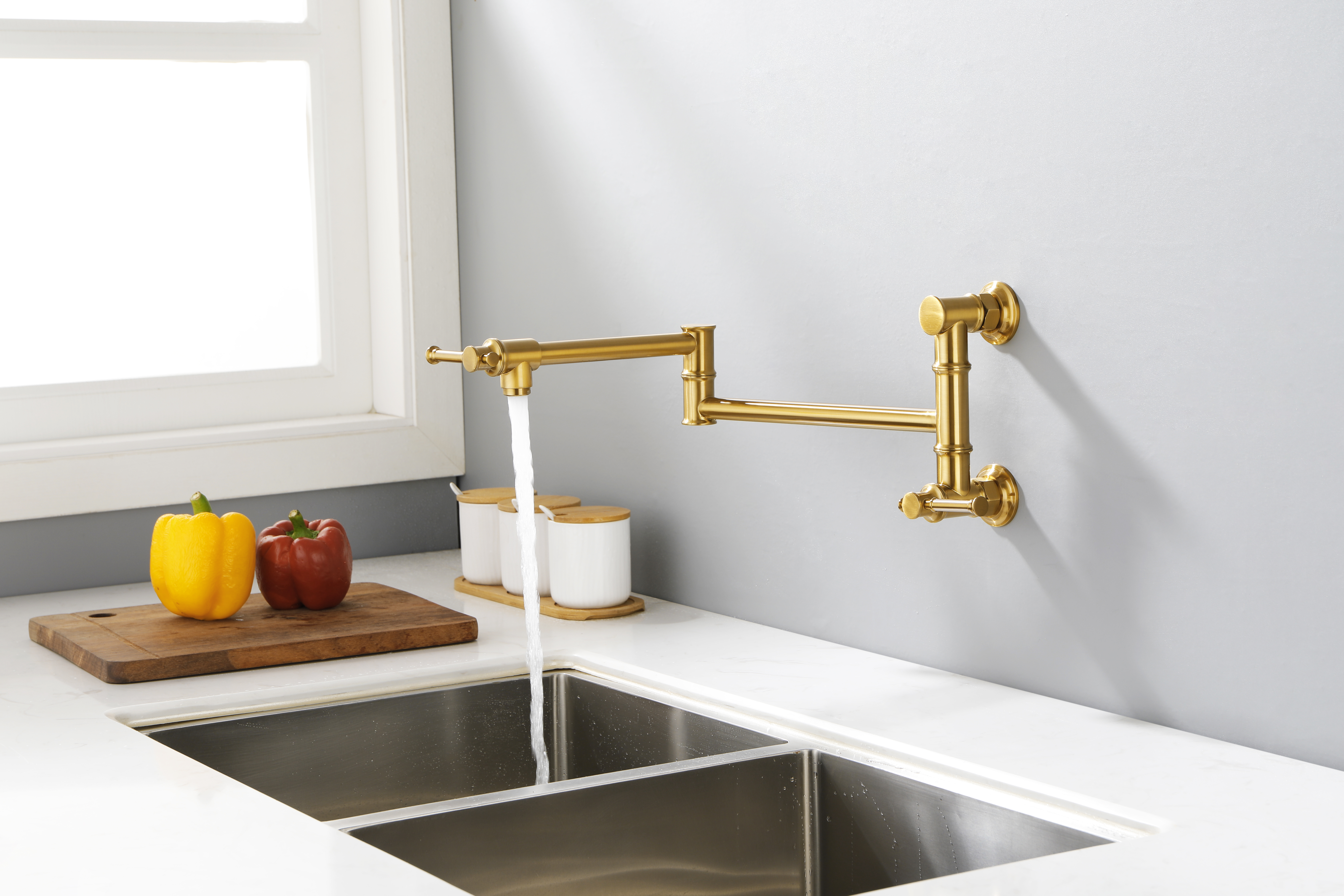 W2287 Wall mounted Pot Filler Faucet, Modern Brass Pot Filler Two-Attachment Wall Mount Folding Kitchen Pot Filler Swing Arm. Works well as accent or supplemental wall lighting for hallways, bedrooms, bathrooms, and other interior spaces. Material: brass. Product dimensions and weight: length 15.5, width 12, height 2, weight 5.2.