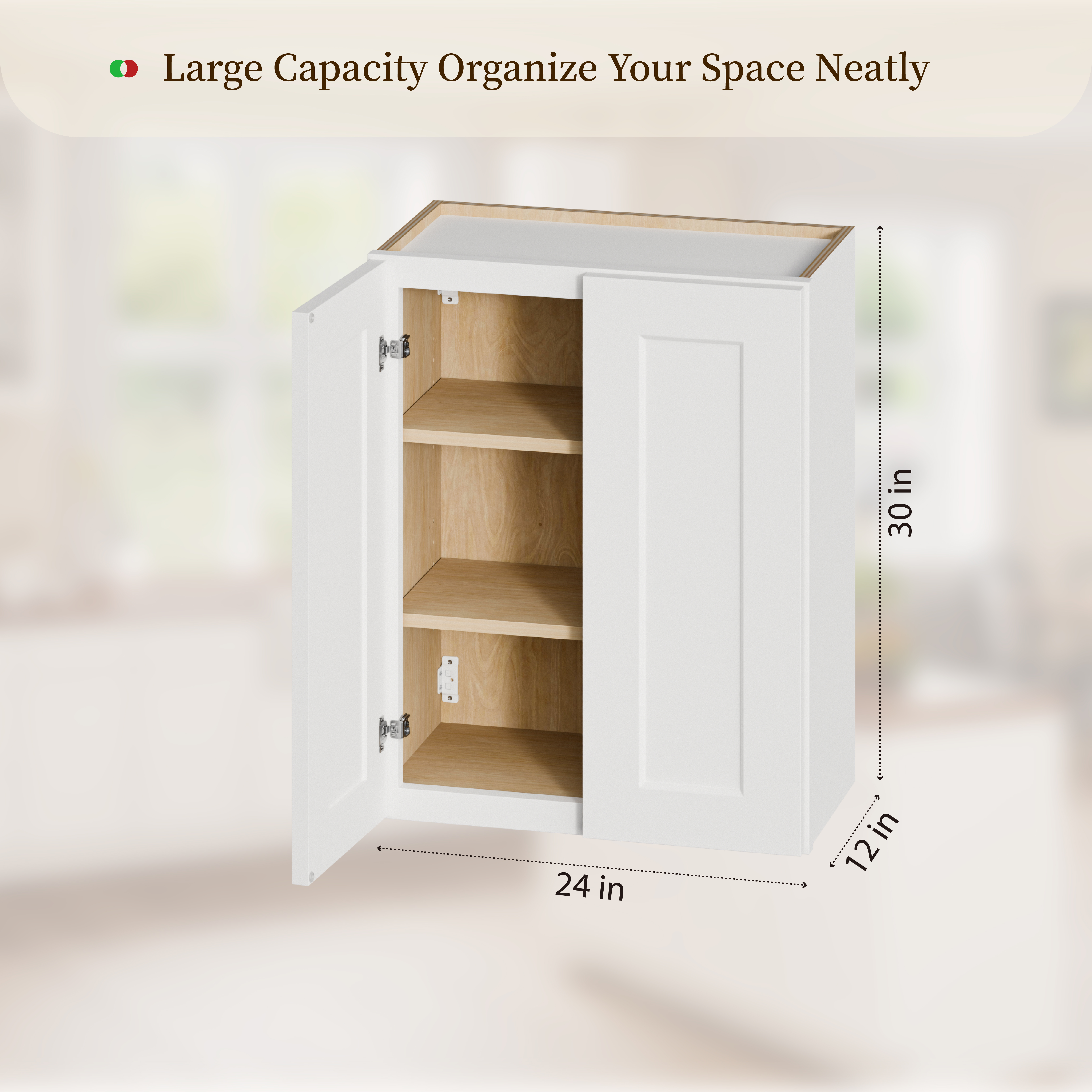Shaker Made White Shaker Solid Wood Wall Cabinet with Soft-Close Doors, Adjustable Shelves - 24" Double Door Storage for Kitchen, Bathroom, Laundry, Garage (Easy Assembly, 24"W x 12"D x 30"H). Works well as accent or supplemental wall lighting for hallways, bedrooms, bathrooms, and other interior spaces. Material: Wood + Synthetic Wood. Product dimensions and weight: length 31.77, width 25.39, height 4.92, weight 39.33.